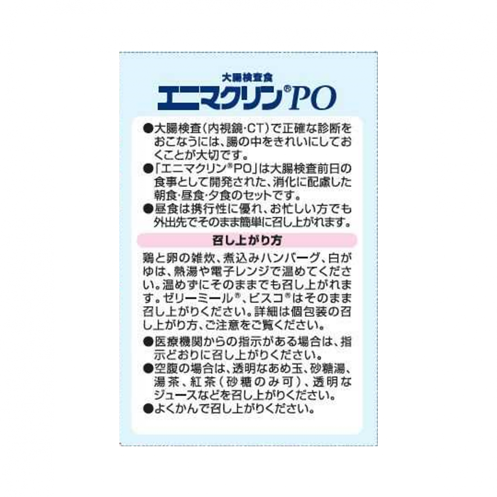 ■「エニマクリンPO」は大腸検査前日の食事として開発された、消化に配慮した朝食・昼食夕食のセットです。
