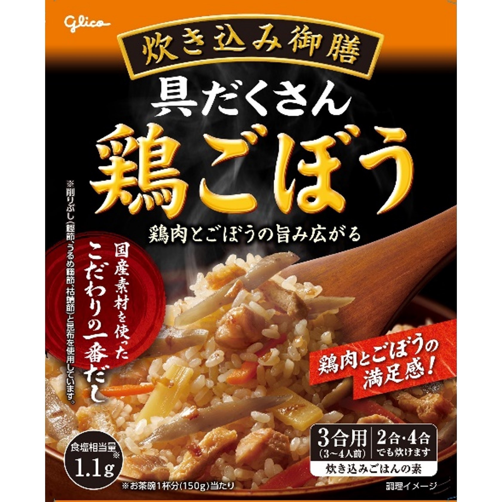 4つの国産素材(鰹節、うるめ鰯節、枯鯖節、昆布)を使用した香り立ちのよい「こだわりの一番だし」を使用しました。5種の具材(ささがきごぼう、にんじん、たけのこ、鶏肉、油揚げ)が入った「具だくさん」の炊き込みごはんの素です。だしの旨味を効かせて、お茶碗1杯分(150g)当たりの食塩相当量を1.1gに抑えた、からだにやさしいおいしさです。
