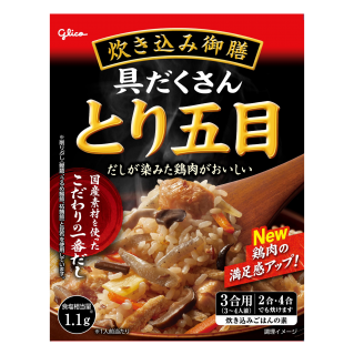 4つの国産素材(鰹節、うるめ鰯節、枯鯖節、昆布)を使用した香り立ちのよい「こだわりの一番だし」を使用しました。10種類の具材(にんじん、ごぼう、たけのこ、しいたけ、ひら茸、わらび、きくらげ、鶏肉、こんにゃく、油揚げ)が入った「具だくさん」の炊き込みごはんの素です。だしの旨味を効かせて、お茶碗1杯分(150g)当たりの食塩相当量を1.1gに抑えた、からだにやさしいおいしさです。