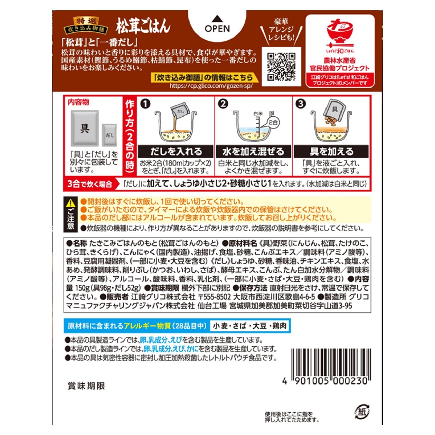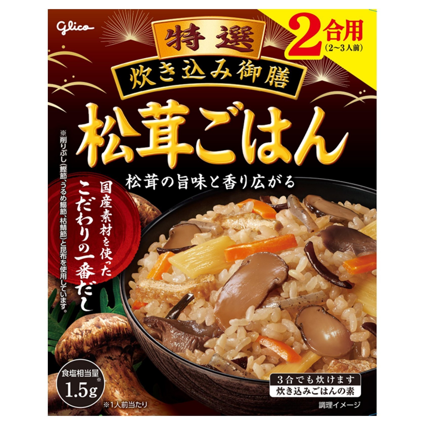 4つの国産素材(鰹節、うるめ鰯節、枯鯖節、昆布)を使用した香り立ちのよい「こだわりの一番だし」を使用しました。7種類の具材(にんじん、松茸、たけのこ、ひら茸、きくらげ、こんにゃく、油揚げ)が入った炊き込みご飯の素です。松茸の贅沢な香りと味わいが楽しめます。だしの旨味を効かせて、お茶碗1杯分(150g)当たりの食塩相当量を1.5gに抑えた、からだにやさしいおいしさです。