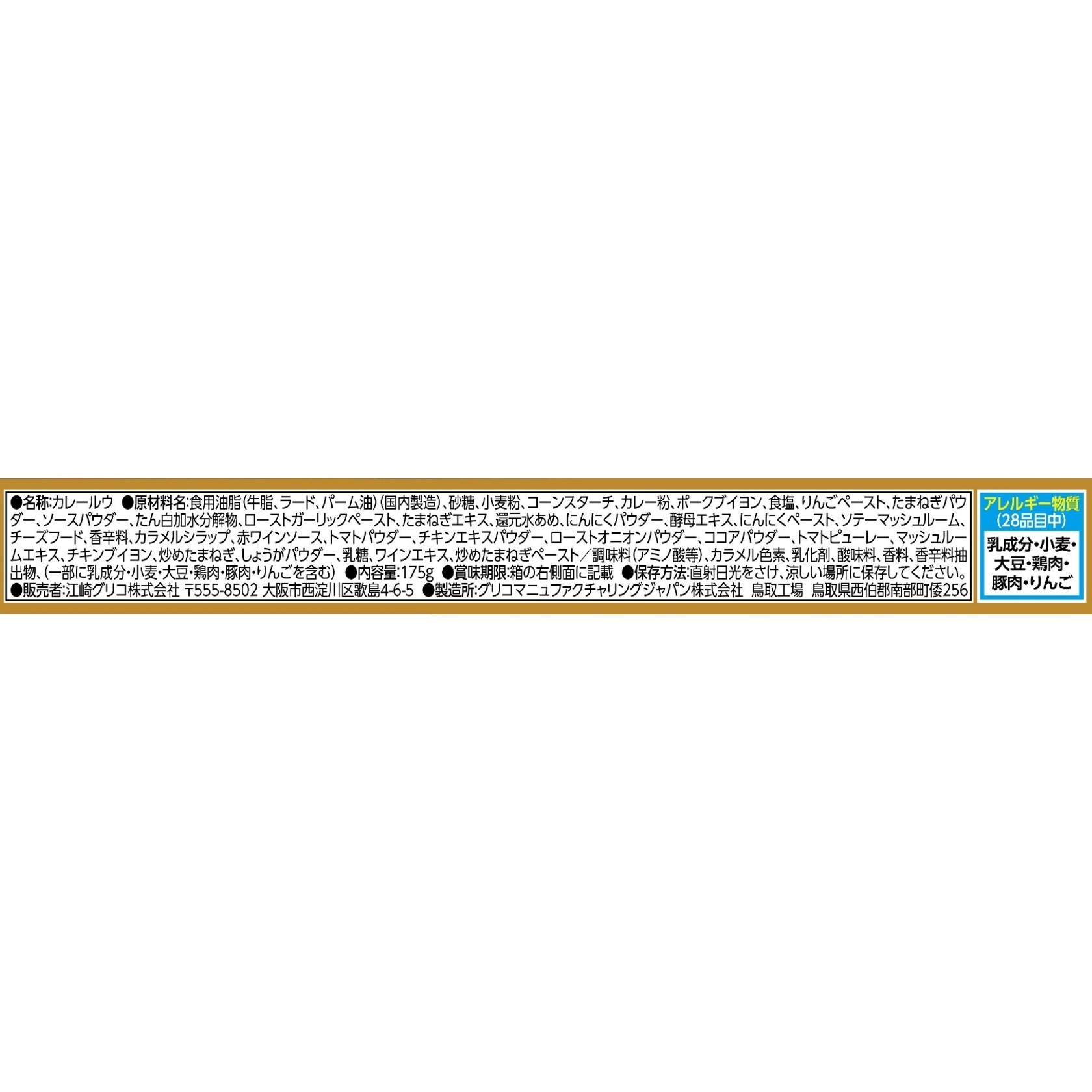 食用油脂(牛脂、ラード、パーム油)(国内製造)、砂糖、小麦粉、コーンスターチ、カレー粉、ポークブイヨン、食塩、りんごペースト、たまねぎパウダー、ソースパウダー、たん白加水分解物、ローストガーリックペースト、たまねぎエキス、還元水あめ、にんにくパウダー、酵母エキス、にんにくペースト、ソテーマッシュルーム、チーズフード、香辛料、カラメルシラップ、赤ワインソース、トマトパウダー、チキンエキスパウダー、ローストオニオンパウダー、ココアパウダー、トマトピューレー、マッシュルームエキス、チキンブイヨン、炒めたまねぎ、しょうがパウダー、乳糖、ワインエキス、炒めたまねぎペースト/調味料(アミノ酸等)、カラメル色素、乳化剤、酸味料、香料、香辛料抽出物、(一部に乳成分・小麦・大豆・鶏肉・豚肉・りんごを含む)