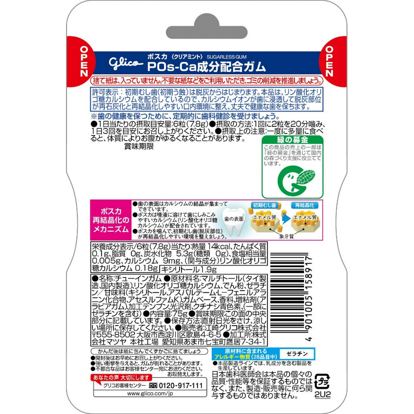 マルチトール(タイ製造、国内製造)、リン酸化オリゴ糖カルシウム、でん粉、ゼラチン/甘味料(キシリトール、アスパルテーム・L-フェニルアラニン化合物、アセスルファムK)、ガムベース、香料、増粘剤(アラビアガム)、加工デンプン、光沢剤、クチナシ青色素、(一部にゼラチンを含む)