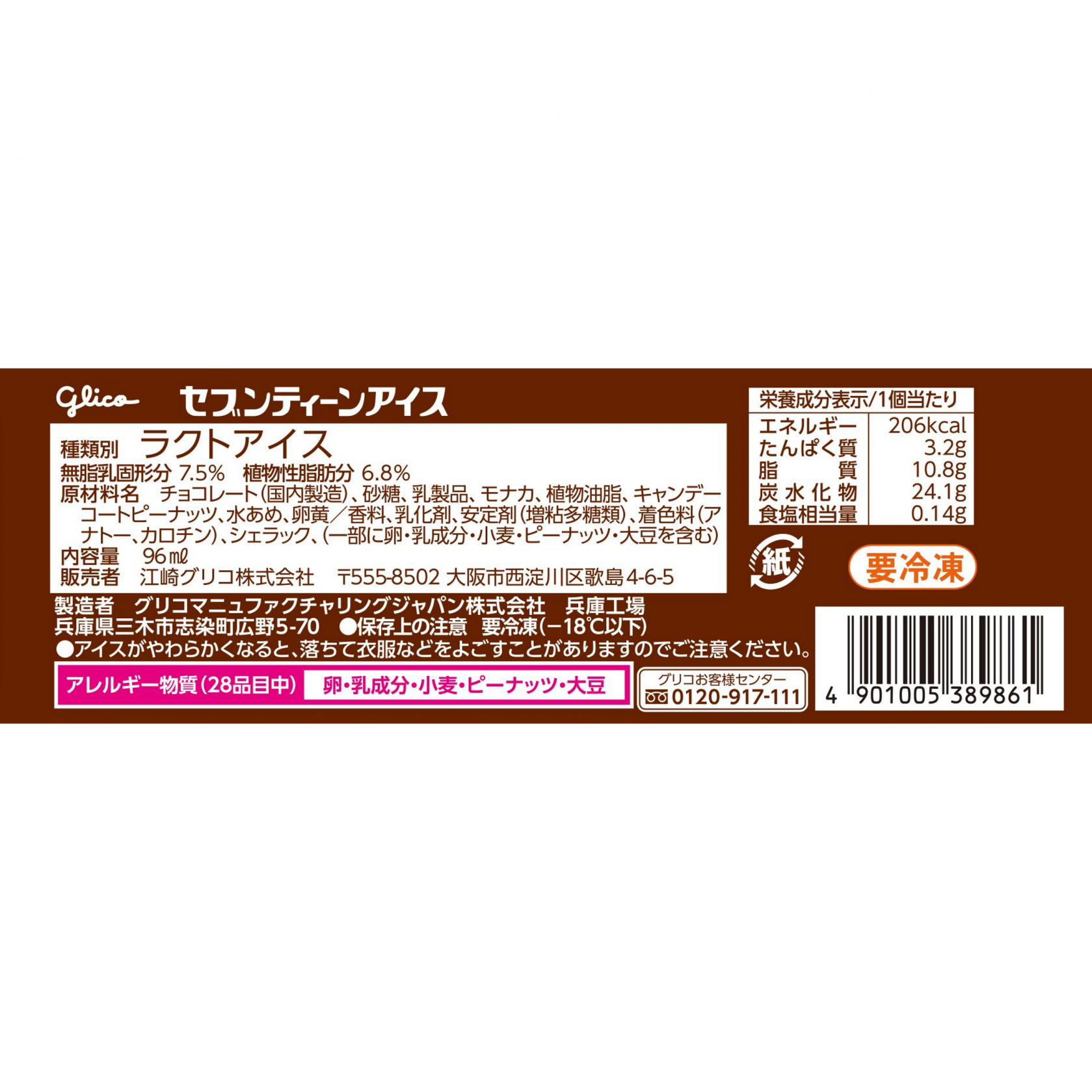 チョコレート(国内製造)、砂糖、乳製品、モナカ、植物油脂、キャンデーコートピーナッツ、水あめ、卵黄/香料、乳化剤、安定剤(増粘多糖類)、着色料(アナトー、カロチン)、シェラック、(一部に卵・乳成分・小麦・ピーナッツ・大豆を含む)