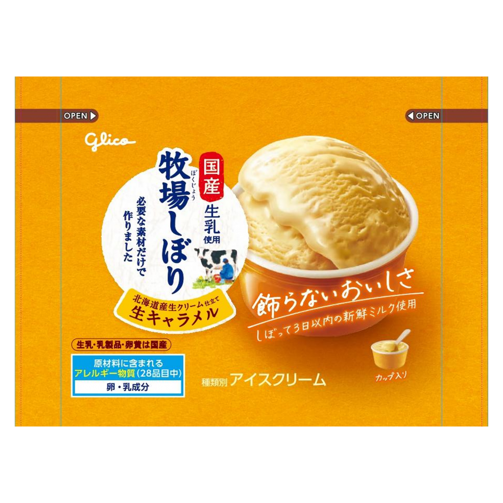 牧場で食べたあの味を届けたい。国産「生ミルク」(生乳=しぼったままの牛乳)を使ったアイスクリームです。使っているのは国産原料を中心に食品素材だけ(乳製品、卵黄も国産)。砂糖と北海道産生クリームのみで作った生キャラメルのコクと雑味のない滑らかな後口をお楽しみください。