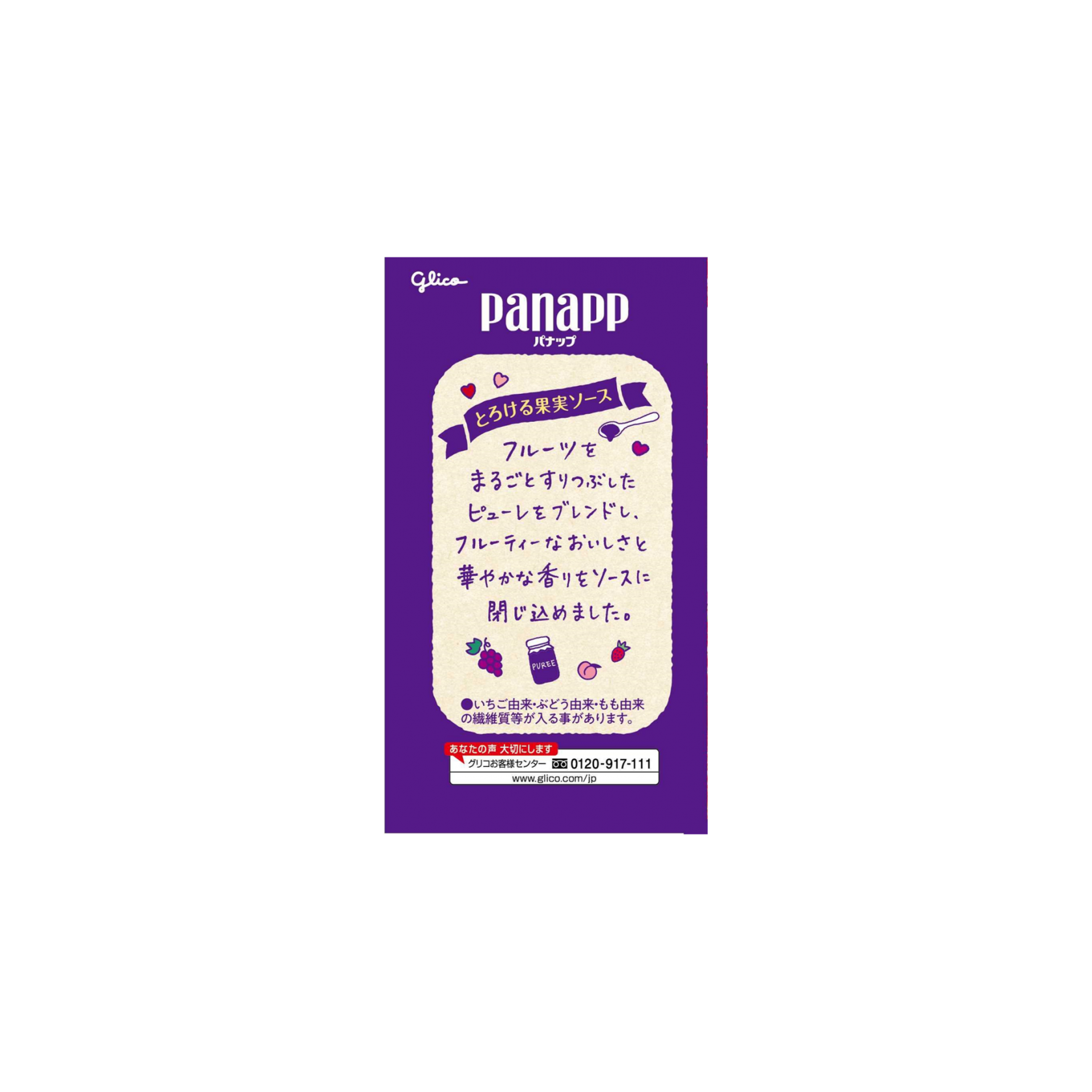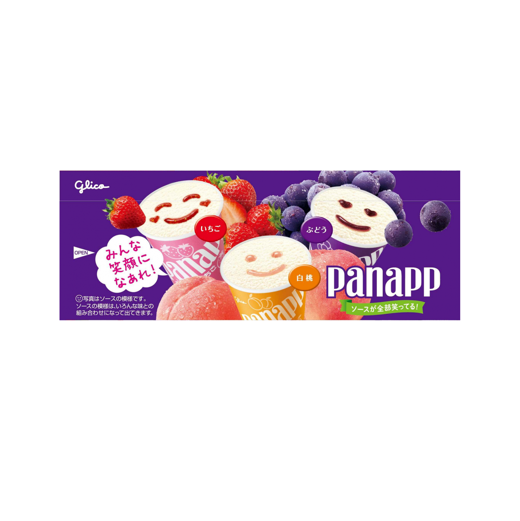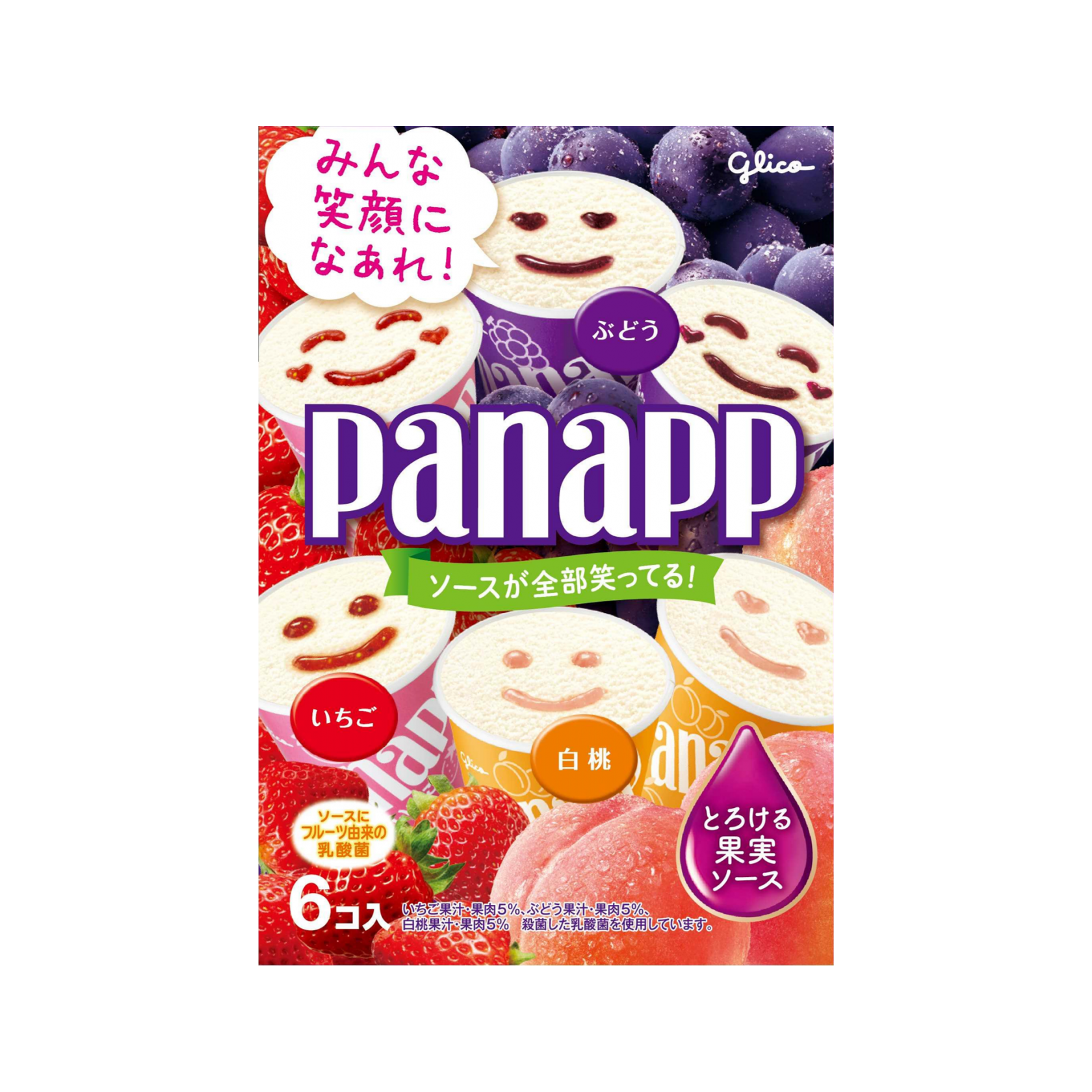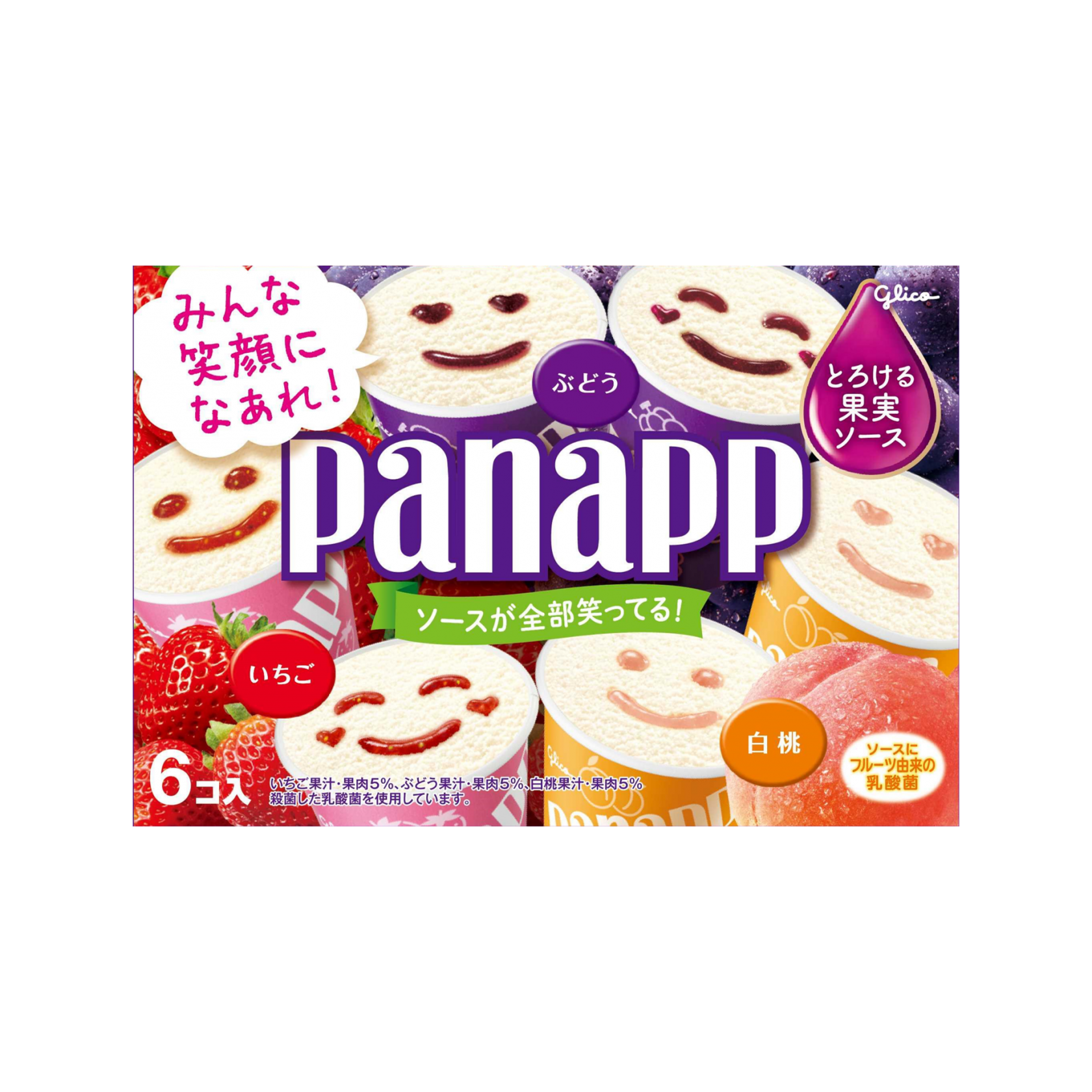 アイスとソースのハーモニーが楽しめるぶどう、いちご、白桃3種の6コ入りミニカップアイスです。「とろける果実ソース」は、フルーツをまるごとすりつぶしたピューレをブレンドし、フルーティーなおいしさと華やかな香りをソースに閉じ込めました。アイスは「フルーツ由来の乳酸菌」入りで、ピューレ仕立てのとろける果実ソースのおいしさを引き立てた、ミルクのコクとやさしい甘味がある濃厚で後口すっきりな味わいです。笑顔の形にソースが入ったパナップで気持ちが盛り上がります。