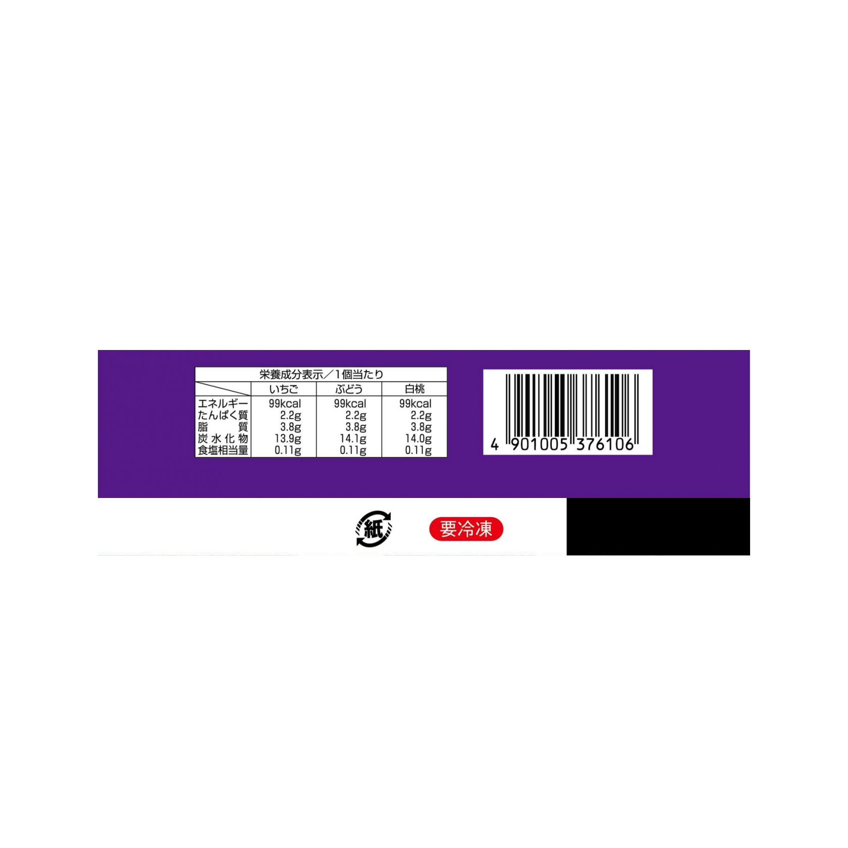 見出し(表示されません) 見出し(表示されません) 見出し(表示されません) 見出し(表示されません) いちご ぶどう 白桃 エネルギー 99kcal 99kcal 99kcal たんぱく質 2.2g 2.2g 2.2g 脂質 3.8g 3.8g 3.8g 炭水化物 13.9g 14.1g 14.0g 食塩相当量 0.11g 0.11g 0.11g