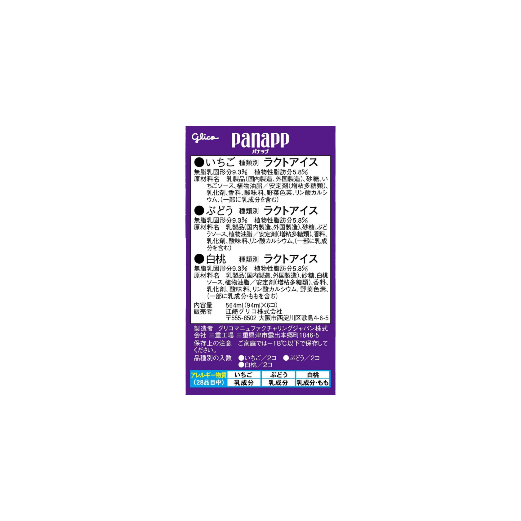 乳製品(国内製造、外国製造)、砂糖、白桃ソース、植物油脂/安定剤(増粘多糖類)、香料、乳化剤、酸味料、リン酸カルシウム、野菜色素、(一部に乳成分・ももを含む)