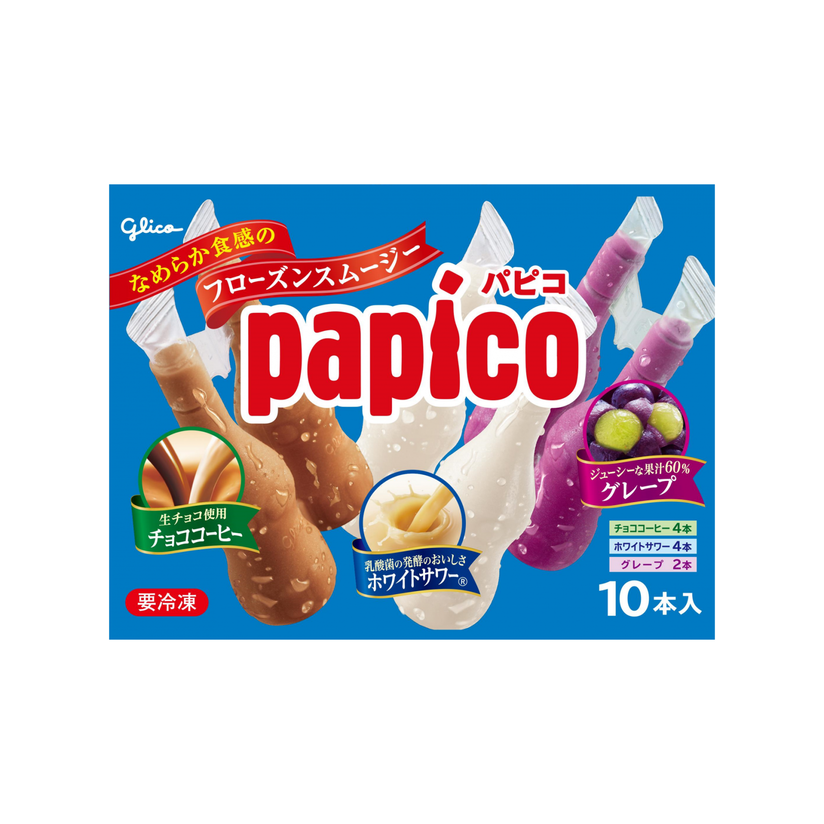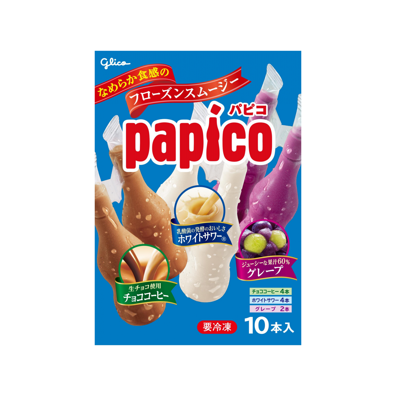 みんなで楽しめる、なめらか食感のフローズンスムージー。<チョココーヒー><ホワイトサワー><グレープ>の3つの味で計10本入りです。