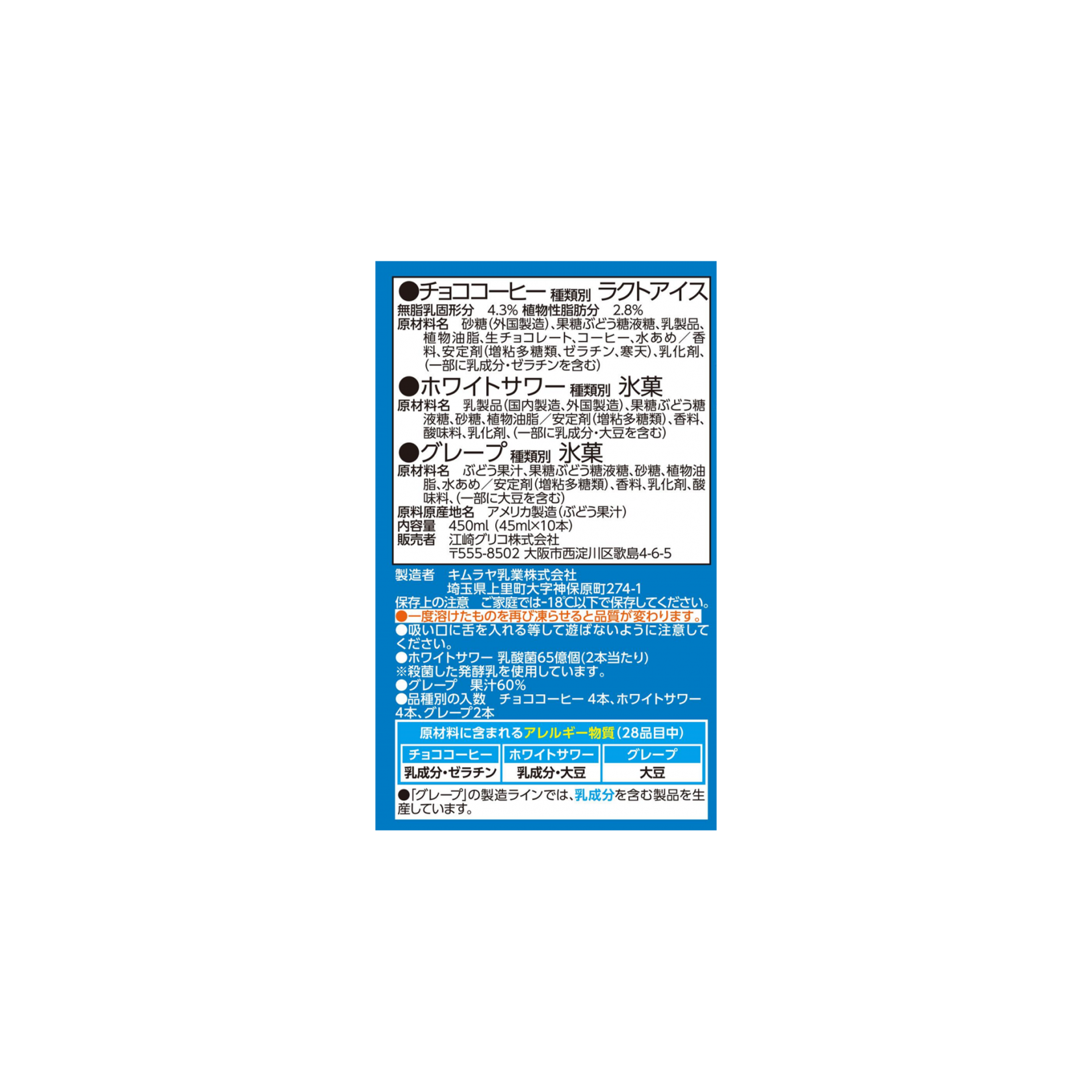 乳製品(国内製造、外国製造)、果糖ぶどう糖液糖、砂糖、植物油脂/安定剤(増粘多糖類)、香料、酸味料、乳化剤、(一部に乳成分・大豆を含む)