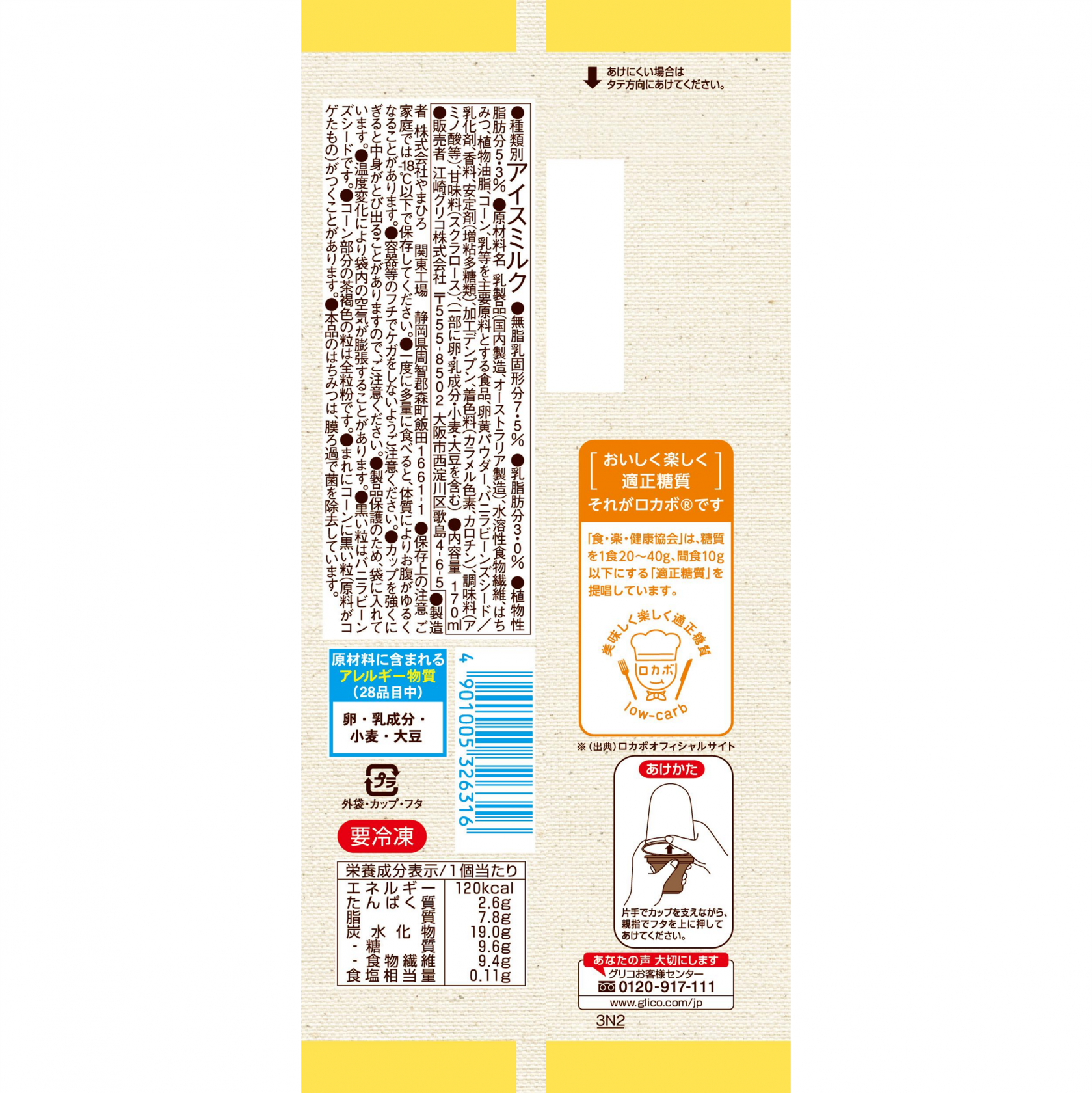 乳製品(国内製造、オーストラリア製造)、水溶性食物繊維、はちみつ、植物油脂、コーン、乳等を主要原料とする食品、卵黄パウダー、バニラビーンズシード/乳化剤、香料、安定剤(増粘多糖類)、加工デンプン、着色料(カラメル色素、カロチン)、調味料(アミノ酸等)、甘味料(スクラロース)、(一部に卵・乳成分・小麦・大豆を含む)