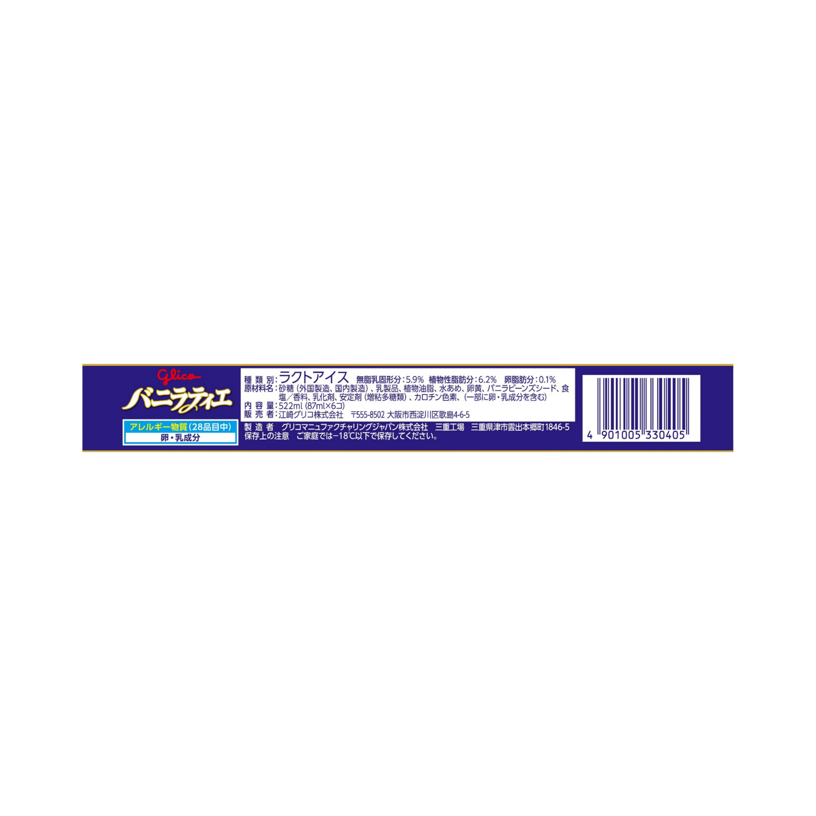砂糖(外国製造、国内製造)、乳製品、植物油脂、水あめ、卵黄、バニラビーンズシード、食塩/香料、乳化剤、安定剤(増粘多糖類)、カロチン色素、(一部に卵・乳成分を含む)