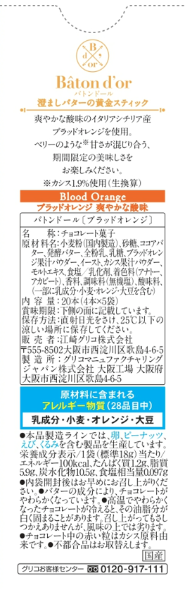 小麦粉(国内製造)、砂糖、ココアバター、発酵バター、全粉乳、乳糖、ブラッドオレンジ果汁パウダー、イースト、カシス果汁パウダー、モルトエキス、食塩/乳化剤、着色料(アナトー、アカビート)、香料、調味料(無機塩)、酸味料、(一部に乳成分・小麦・オレンジ・大豆を含む)