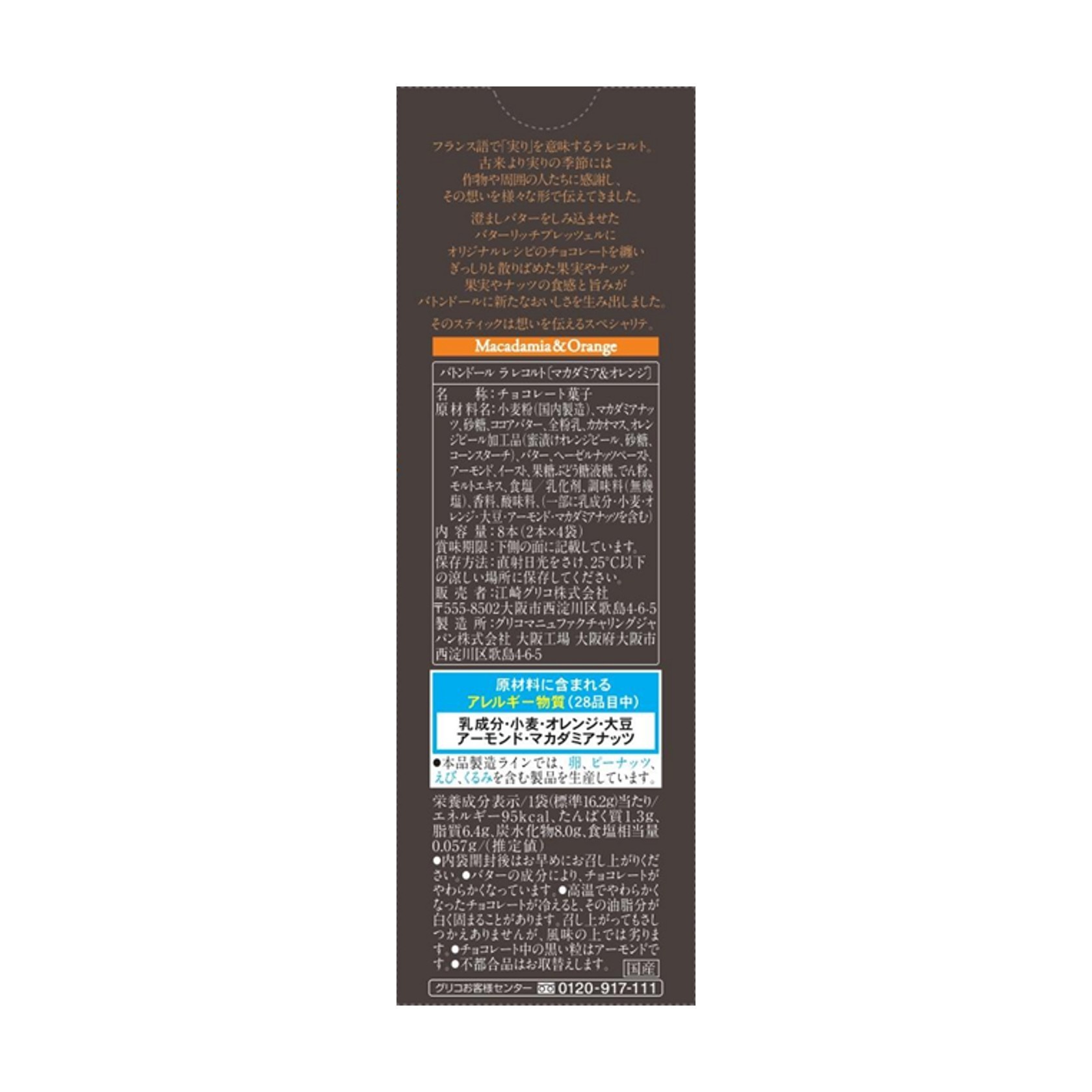 小麦粉(国内製造)、マカダミアナッツ、砂糖、ココアバター、全粉乳、カカオマス、オレンジピール加工品(蜜漬けオレンジピール、砂糖、コーンスターチ)、バター、ヘーゼルナッツペースト、アーモンド、イースト、果糖ぶどう糖液糖、でん粉、モルトエキス、食塩/乳化剤、調味料(無機塩)、香料、酸味料、(一部に乳成分・小麦・オレンジ・大豆・アーモンド・マカダミアナッツを含む)