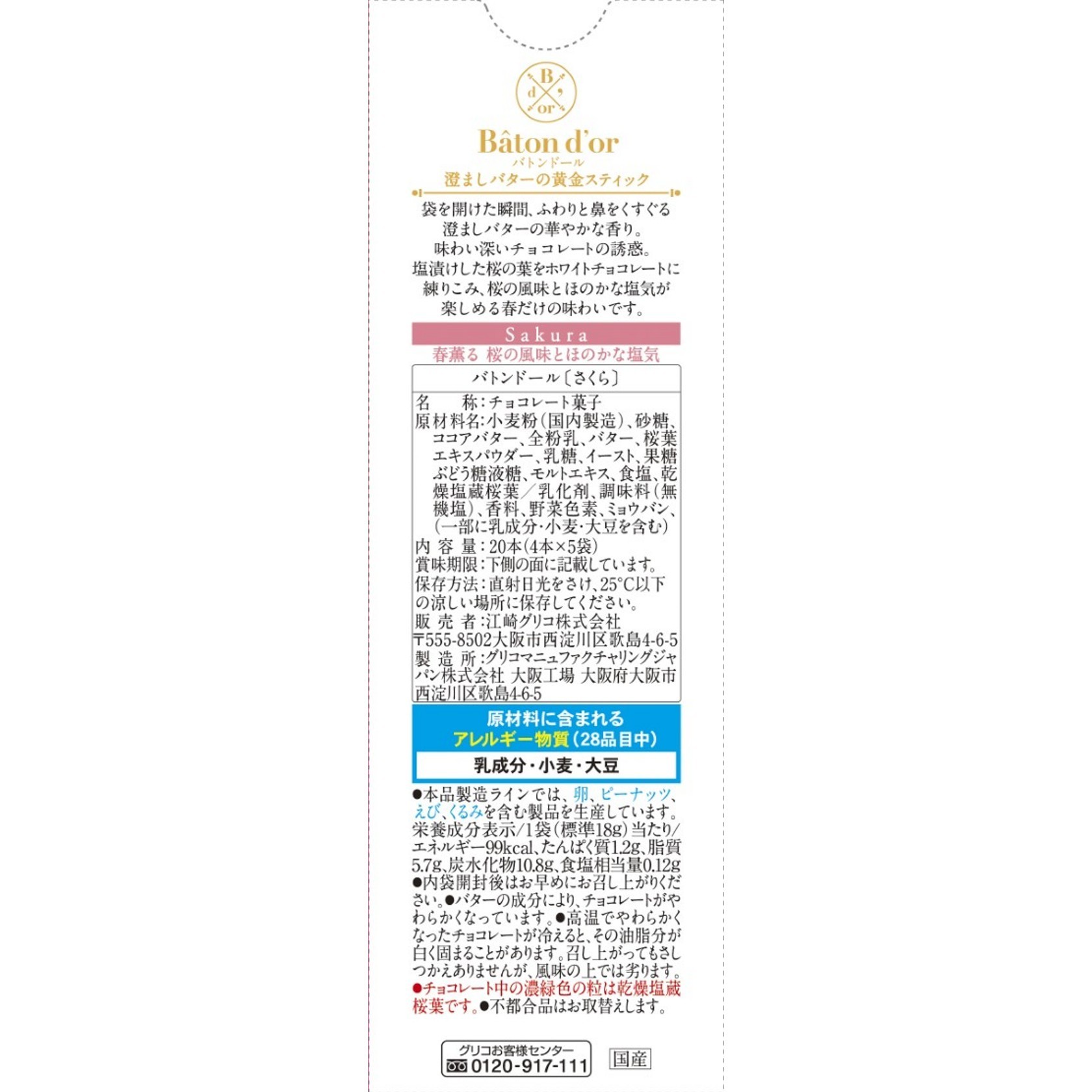 小麦粉(国内製造)、砂糖、ココアバター、全粉乳、バター、桜葉エキスパウダー、乳糖、イースト、果糖ぶどう糖液糖、モルトエキス、食塩、乾燥塩蔵桜葉/乳化剤、調味料(無機塩)、香料、野菜色素、ミョウバン、(一部に乳成分・小麦・大豆を含む)