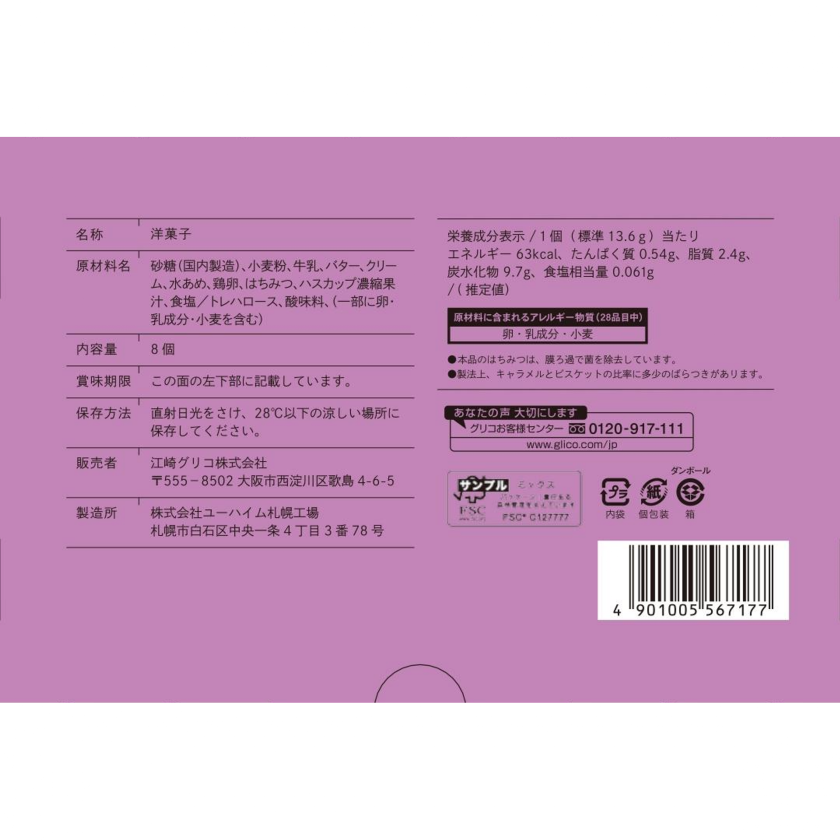砂糖(国内製造)、小麦粉、牛乳、バター、クリーム、水あめ、鶏卵、はちみつ、ハスカップ濃縮果汁、食塩/トレハロース、酸味料、(一部に卵・乳成分・小麦を含む)