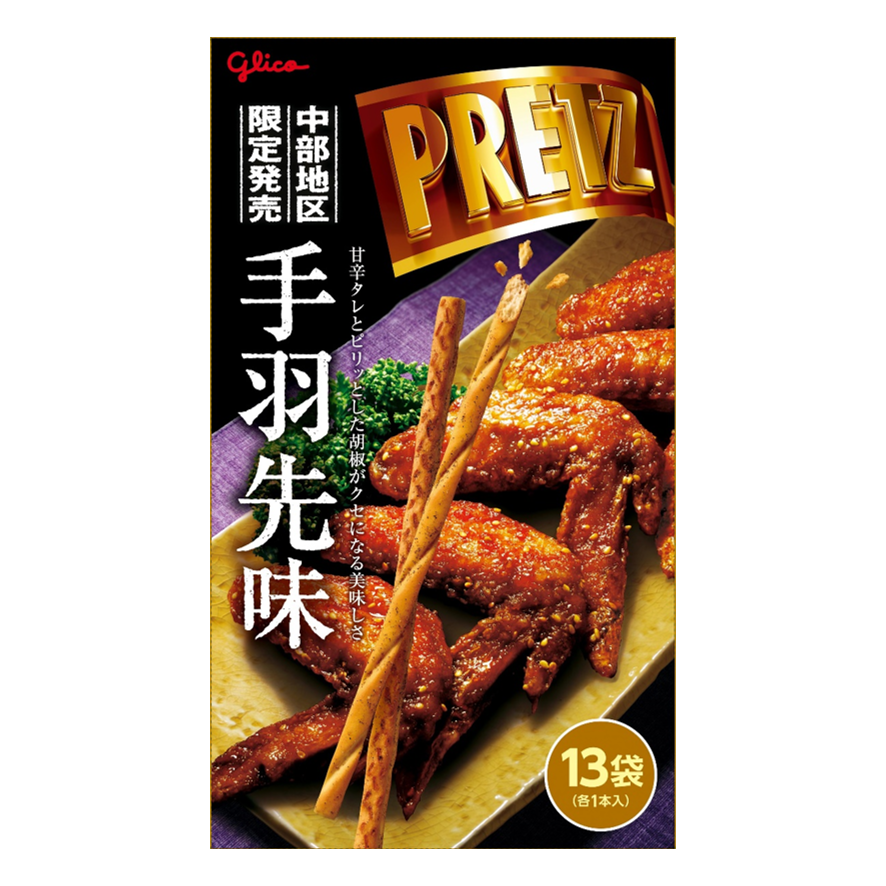 甘辛のタレとピリッとした胡椒をアクセントにした中部地区限定のお土産プリッツです。手羽先の香ばしい味わいをお楽しみください。みんなに分けやすい13袋入り!