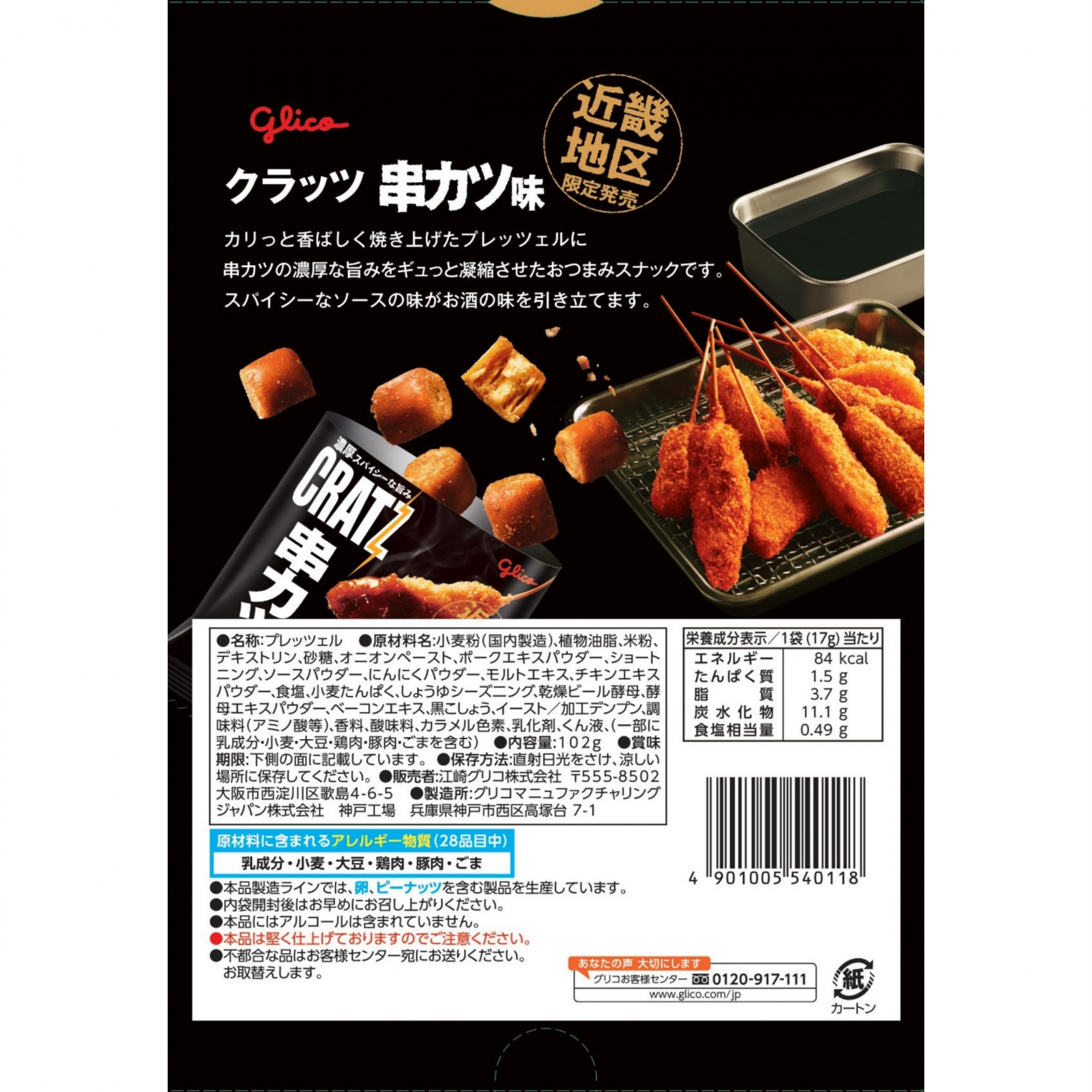 外側はカリッと、内側はサクッとした、噛み応えの良い食感が楽しめます。濃厚スパイシーな味が楽しめる串カツ味のお土産クラッツです。