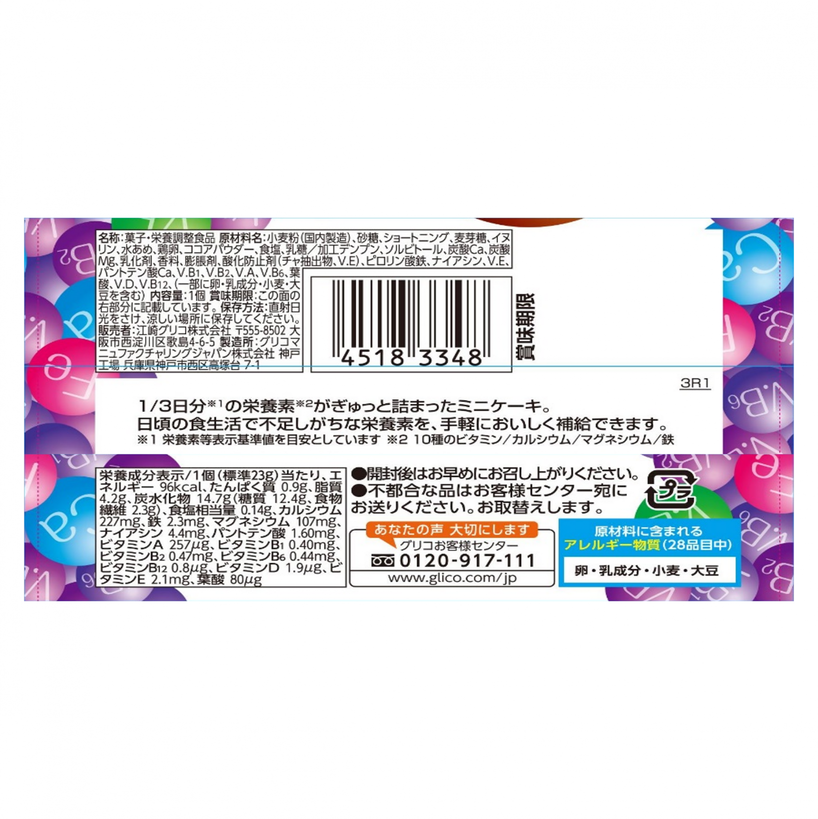 小麦粉(国内製造)、砂糖、ショートニング、麦芽糖、イヌリン、水あめ、鶏卵、ココアパウダー、食塩、乳糖/加工デンプン、ソルビトール、炭酸Ca、炭酸Mg、乳化剤、香料、膨脹剤、酸化防止剤(チャ抽出物、V.E)、ピロリン酸鉄、ナイアシン、V.E、パントテン酸Ca、V.B1、V.B2、V.A、V.B6、葉酸、V.D、V.B12、(一部に卵・乳成分・小麦・大豆を含む)