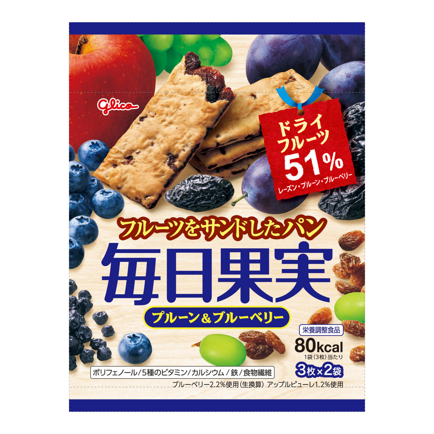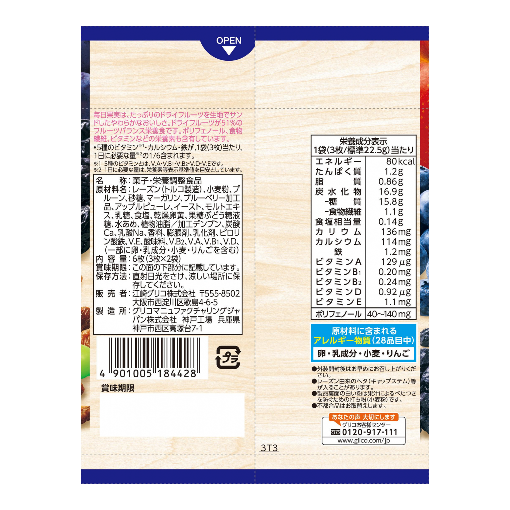 たっぷりのドライフルーツ(レーズン、プルーン、ブルーベリー)をパン生地でサンドし、しっとりと焼き上げました。ポリフェノール、食物繊維に加え、5種のビタミン、カルシウム、鉄が、1袋(3枚)当たり、1日に必要な量の1/6含まれます。 ※1日に必要な量は、栄養素等表示基準値を目安としています。
