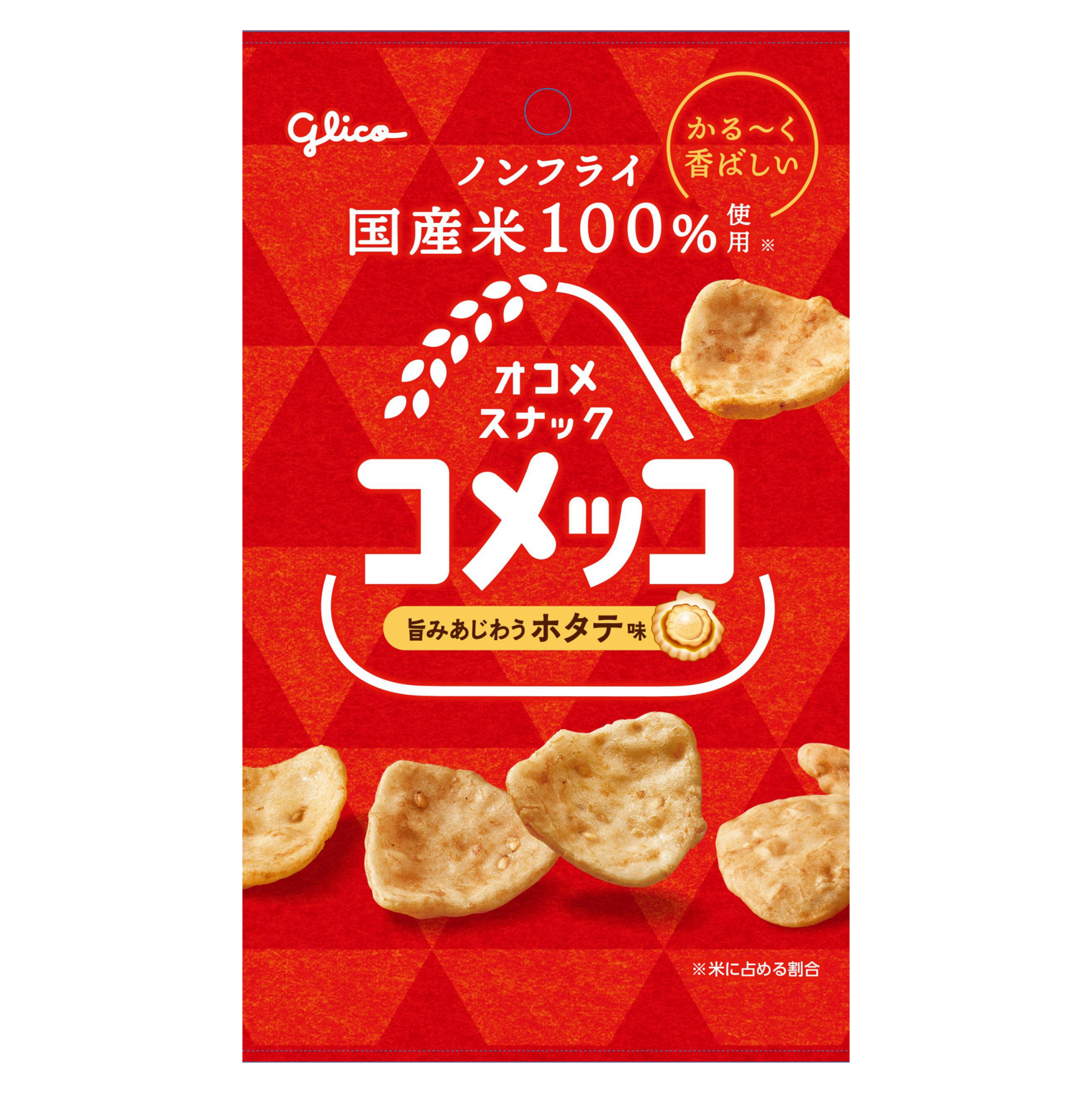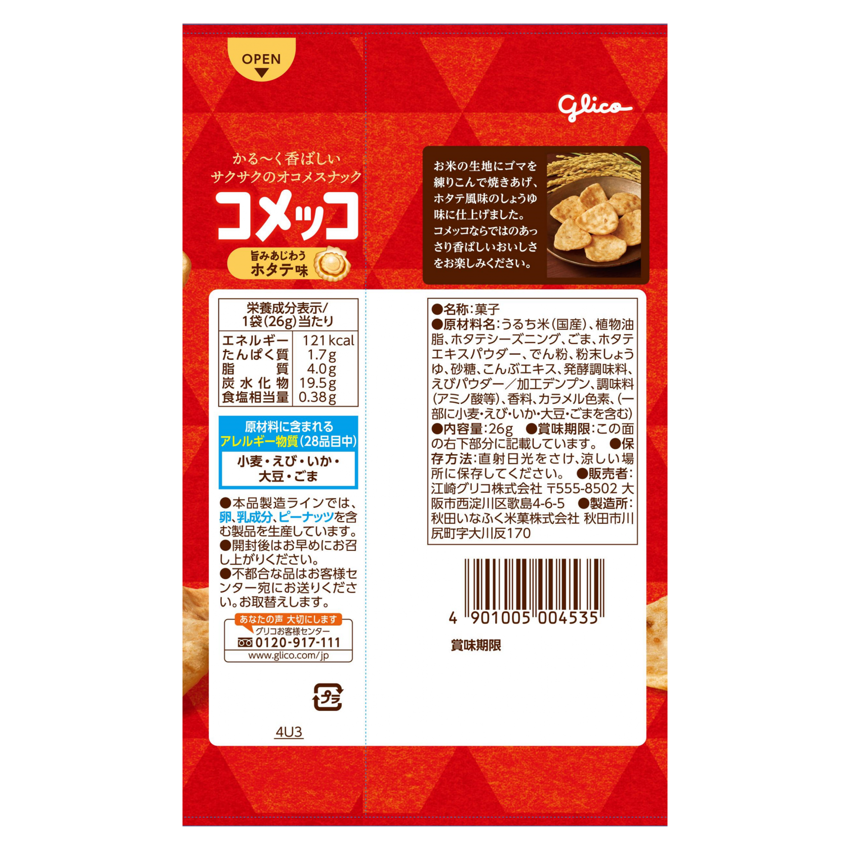 うるち米(国産)、植物油脂、ホタテシーズニング、ごま、ホタテエキスパウダー、でん粉、粉末しょうゆ、砂糖、こんぶエキス、発酵調味料、えびパウダー/加工デンプン、調味料(アミノ酸等)、香料、カラメル色素、(一部に小麦・えび・いか・大豆・ごまを含む)