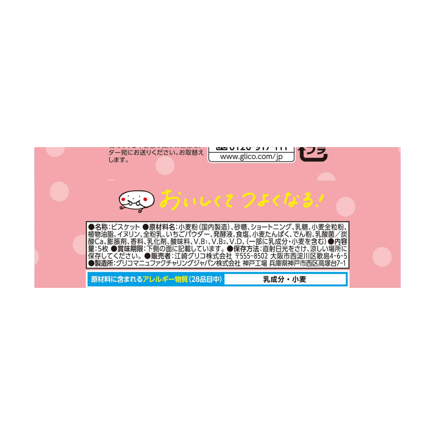 小麦粉(国内製造)、砂糖、ショートニング、乳糖、小麦全粒粉、植物油脂、イヌリン、全粉乳、いちごパウダー、発酵液、食塩、小麦たんぱく、でん粉、乳酸菌/炭酸Ca、膨脹剤、香料、乳化剤、酸味料、V.B1、V.B2、V.D、(一部に乳成分・小麦を含む)