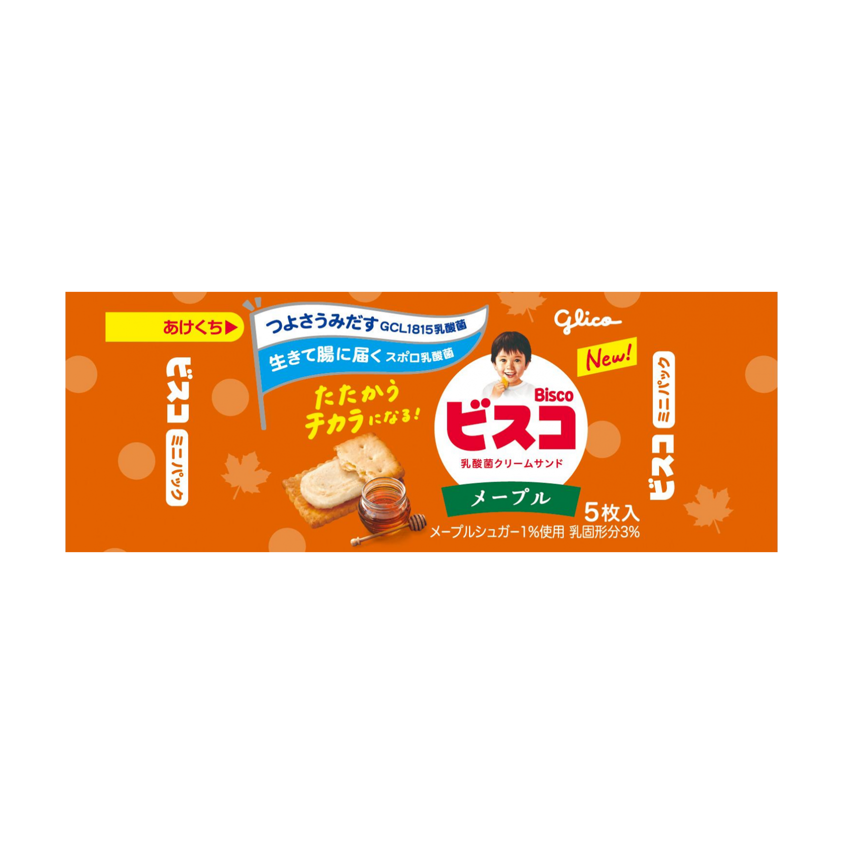 つよさうみだすGCL1815乳酸菌と生きて腸に届くスポロ乳酸菌入り。 メープルクリームとサクッとした全粒粉入りミルクビスケット。メープルの甘い香りに包まれる、家族みんなで楽しんでいただける乳酸菌クリームサンドです。 食物繊維、カルシウム、ビタミンD、ビタミンB1、ビタミンB2が入っています。※乳固形成分3%