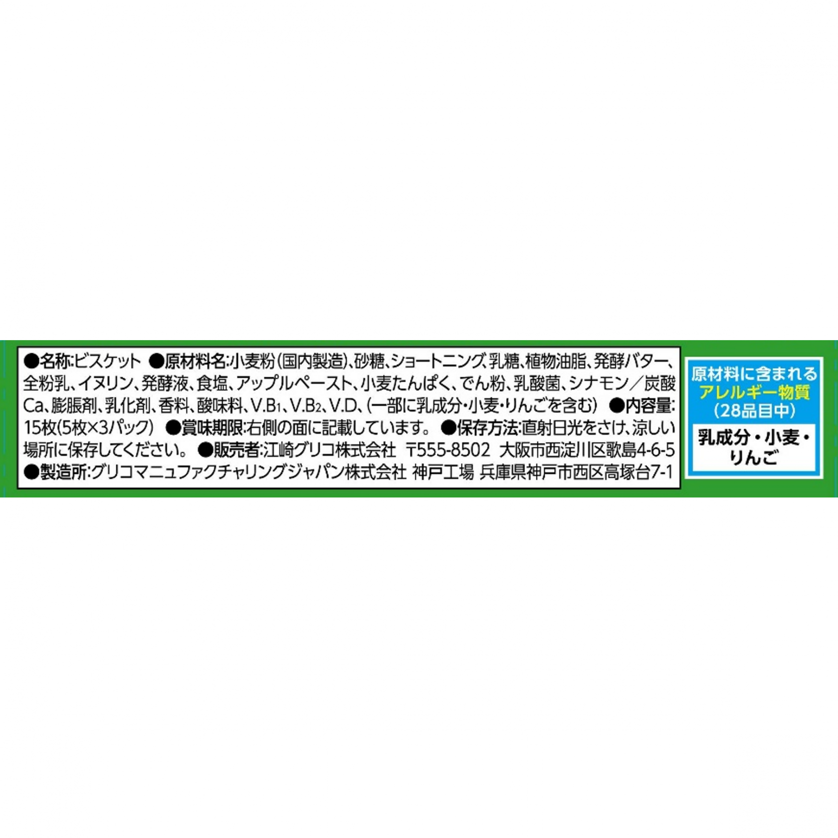 小麦粉(国内製造)、砂糖、ショートニング、乳糖、植物油脂、発酵バター、全粉乳、イヌリン、発酵液、食塩、アップルペースト、小麦たんぱく、でん粉、乳酸菌、シナモン/炭酸Ca、膨脹剤、乳化剤、香料、酸味料、V.B1、V.B2、V.D、(一部に乳成分・小麦・りんごを含む)