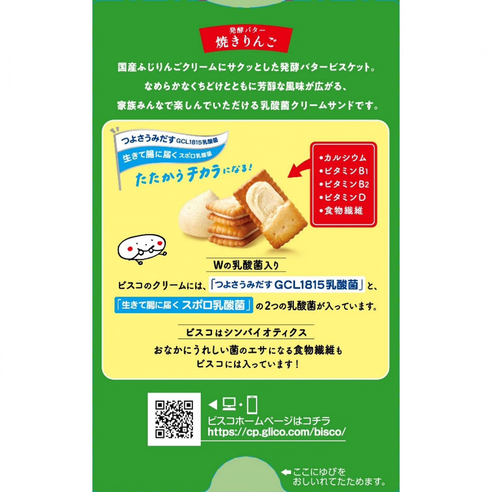 つよさうみだすGCL1815乳酸菌と生きて腸に届くスポロ乳酸菌入り。 国産ふじりんごクリームとサクッとしたバタービスケット。 なめらかなくちどけとともに芳醇な風味が広がる、家族みんなで楽しんでいただける乳酸菌クリームサンドです。 食物繊維、カルシウム、ビタミンD、ビタミンB1、ビタミンB2が入っています。