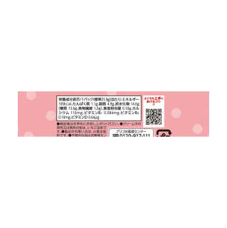 見出し(表示されません) 見出し(表示されません) エネルギー 105kcal たんぱく質 1.1g 脂質 4.9g 炭水化物 14.6g -糖質 13.6g -食物繊維 1.0g 食塩相当量 0.10g カルシウム 116mg ビタミンB1 0.084mg ビタミンB2 0.10mg ビタミンD 0.64μg 参考値 1パック(標準21.5g)当たり