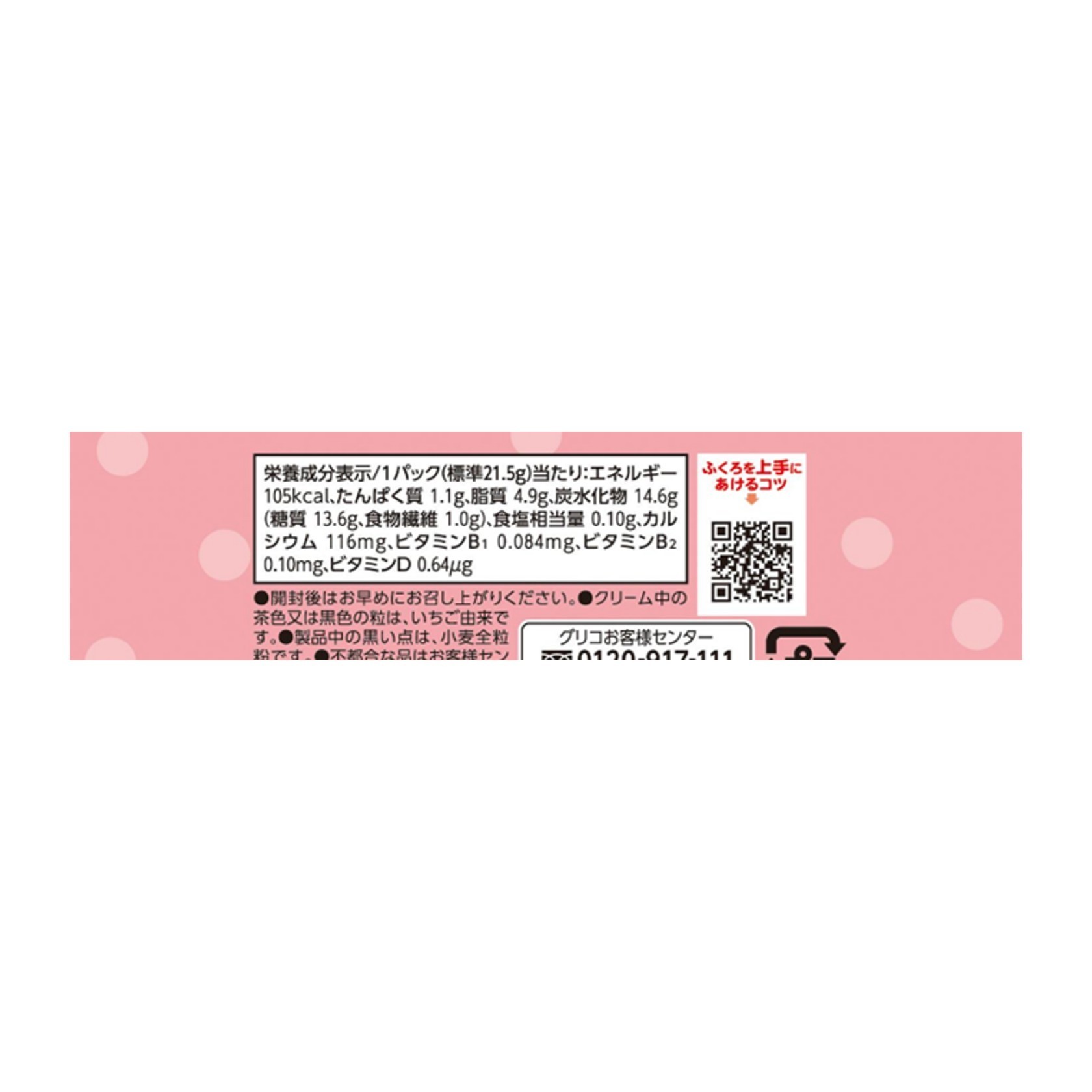 見出し(表示されません) 見出し(表示されません) エネルギー 105kcal たんぱく質 1.1g 脂質 4.9g 炭水化物 14.6g -糖質 13.6g -食物繊維 1.0g 食塩相当量 0.10g カルシウム 116mg ビタミンB1 0.084mg ビタミンB2 0.10mg ビタミンD 0.64μg 参考値 1パック(標準21.5g)当たり