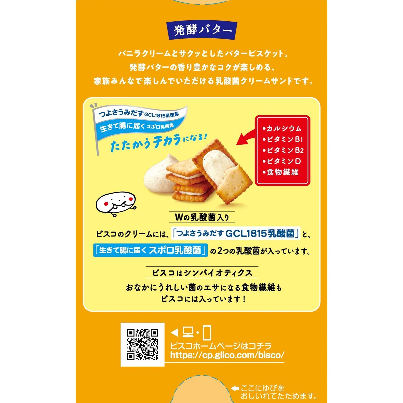つよさうみだすGCL1815乳酸菌と生きて腸に届くスポロ乳酸菌入り。 バニラクリームとサクッとしたバタービスケット。発酵バターの香り豊かなコクが楽しめる、家族みんなで楽しんでいただける乳酸菌クリームサンドです。 食物繊維、カルシウム、ビタミンD、ビタミンB1、ビタミンB2が入っています。