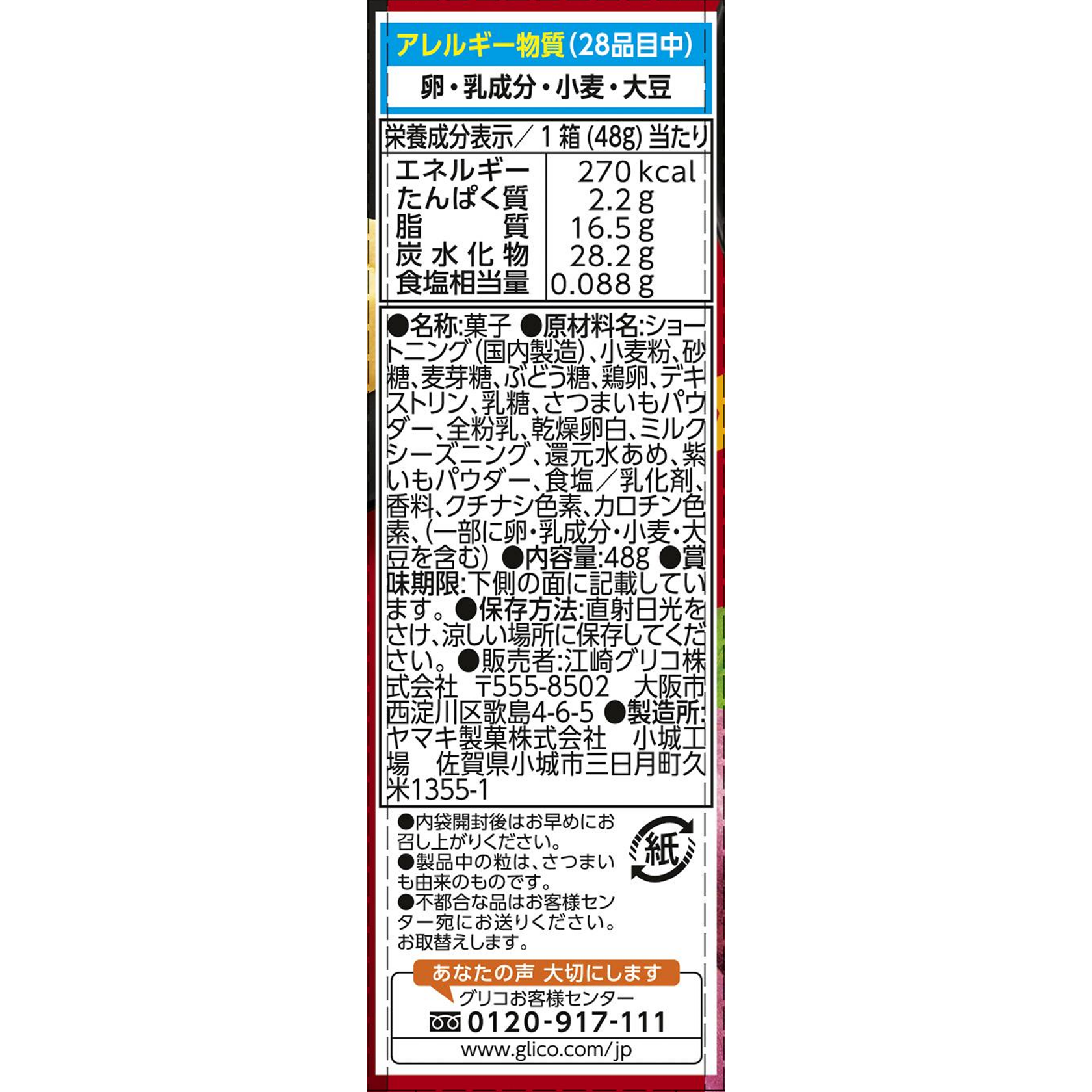 ショートニング(国内製造)、小麦粉、砂糖、麦芽糖、ぶどう糖、鶏卵、デキストリン、乳糖、さつまいもパウダー、全粉乳、乾燥卵白、ミルクシーズニング、還元水あめ、紫いもパウダー、食塩/乳化剤、香料、クチナシ色素、カロチン色素、(一部に卵・乳成分・小麦・大豆を含む)