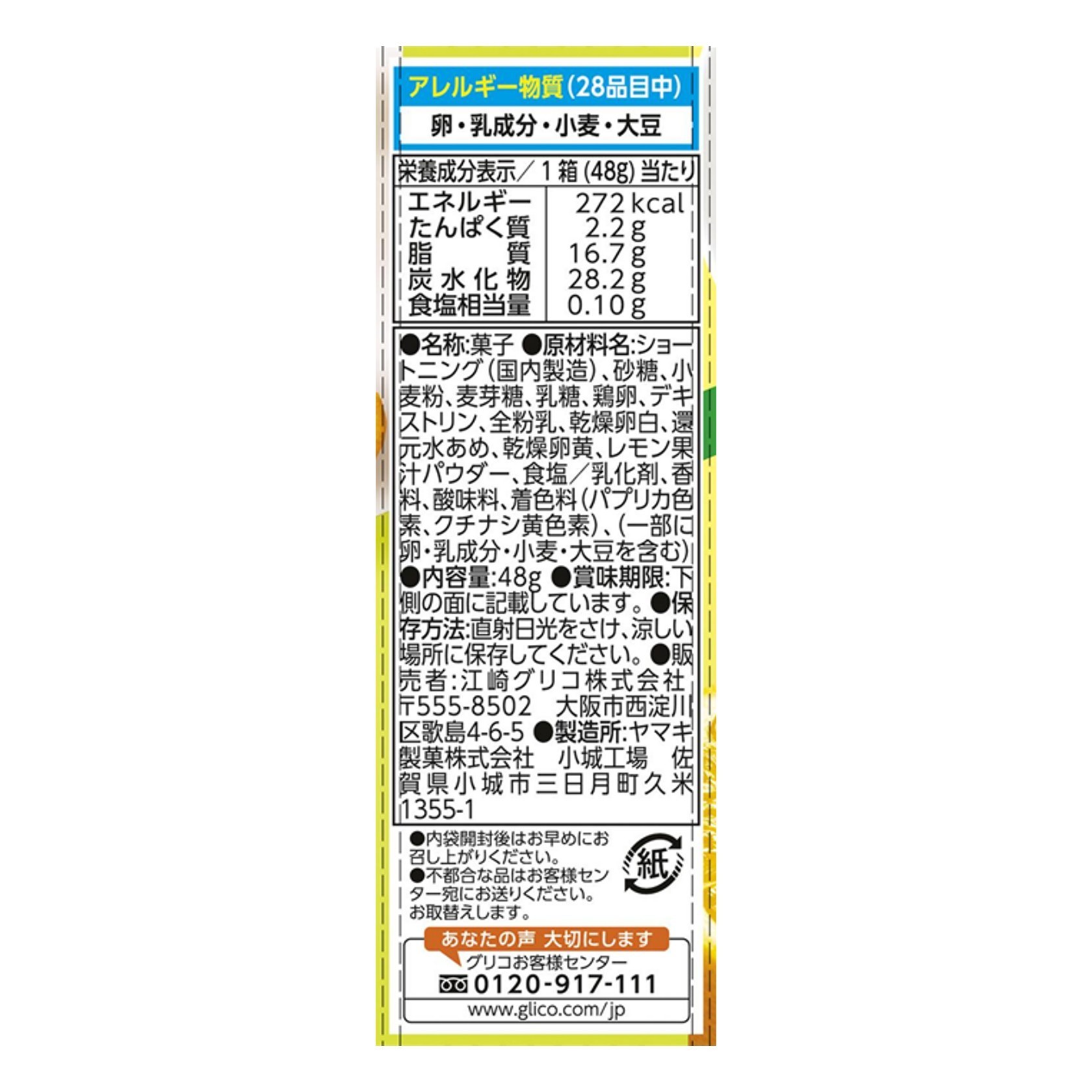 ショートニング(国内製造)、砂糖、小麦粉、麦芽糖、乳糖、鶏卵、デキストリン、全粉乳、乾燥卵白、還元水あめ、乾燥卵黄、レモン果汁パウダー、食塩/乳化剤、香料、酸味料、着色料(パプリカ色素、クチナシ黄色素)、(一部に卵・乳成分・小麦・大豆を含む)