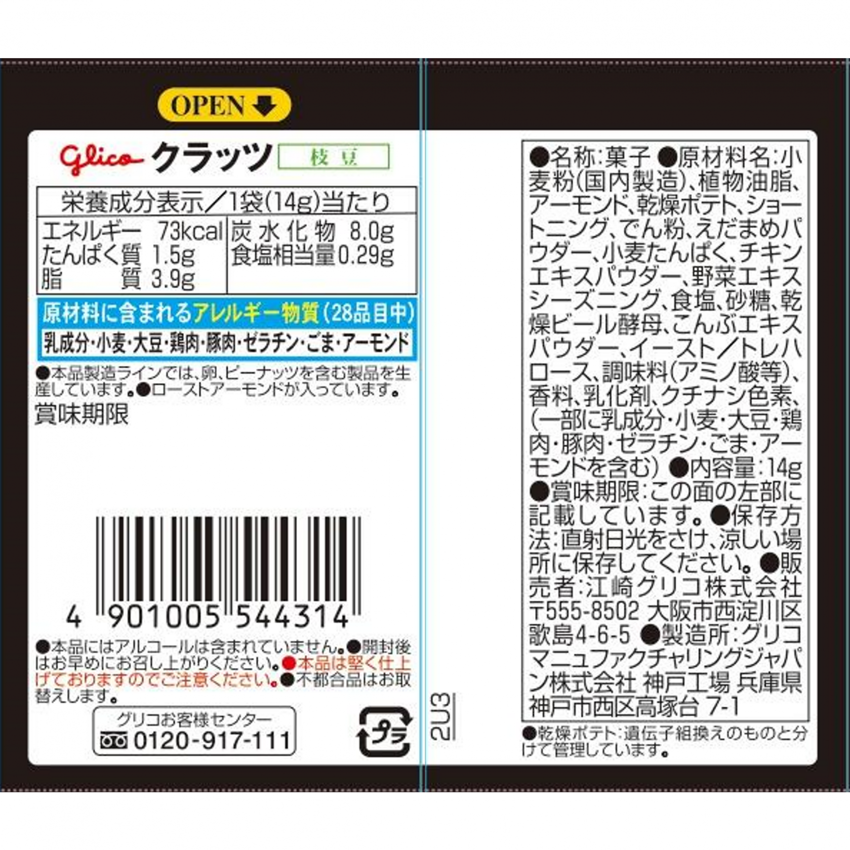 小麦粉(国内製造)、植物油脂、アーモンド、乾燥ポテト、ショートニング、でん粉、えだまめパウダー、小麦たんぱく、チキンエキスパウダー、野菜エキスシーズニング、食塩、砂糖、乾燥ビール酵母、こんぶエキスパウダー、イースト/トレハロース、調味料(アミノ酸等)、香料、乳化剤、クチナシ色素、(一部に乳成分・小麦・大豆・鶏肉・豚肉・ゼラチン・ごま・アーモンドを含む)