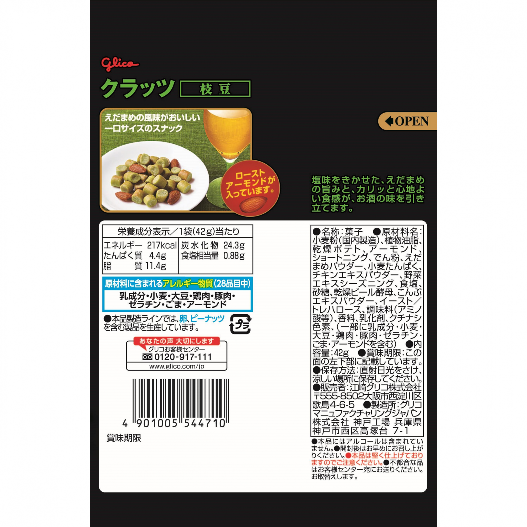 小麦粉(国内製造)、植物油脂、乾燥ポテト、アーモンド、ショートニング、でん粉、えだまめパウダー、小麦たんぱく、チキンエキスパウダー、野菜エキスシーズニング、食塩、砂糖、乾燥ビール酵母、こんぶエキスパウダー、イースト/トレハロース、調味料(アミノ酸等)、香料、乳化剤、クチナシ色素、(一部に乳成分・小麦・大豆・鶏肉・豚肉・ゼラチン・ごま・アーモンドを含む)
