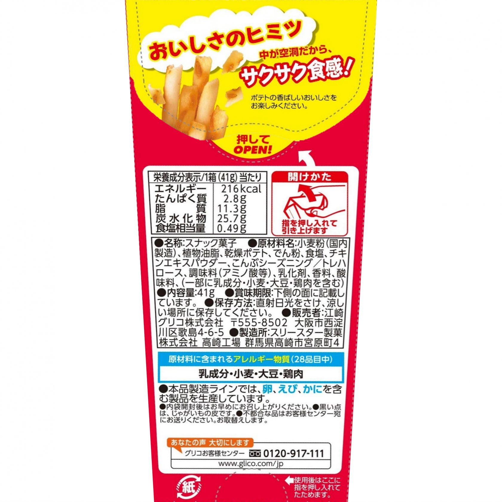 小麦粉(国内製造)、植物油脂、乾燥ポテト、でん粉、食塩、チキンエキスパウダー、こんぶシーズニング/トレハロース、調味料(アミノ酸等)、乳化剤、香料、酸味料、(一部に乳成分・小麦・大豆・鶏肉を含む)