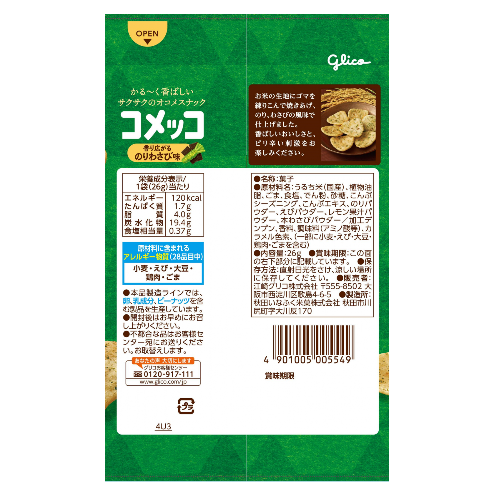 うるち米(国産)、植物油脂、ごま、食塩、でん粉、砂糖、こんぶシーズニング、こんぶエキス、のりパウダー、えびパウダー、レモン果汁パウダー、本わさびパウダー/加工デンプン、香料、調味料(アミノ酸等)、カラメル色素、(一部に小麦・えび・大豆・鶏肉・ごまを含む)