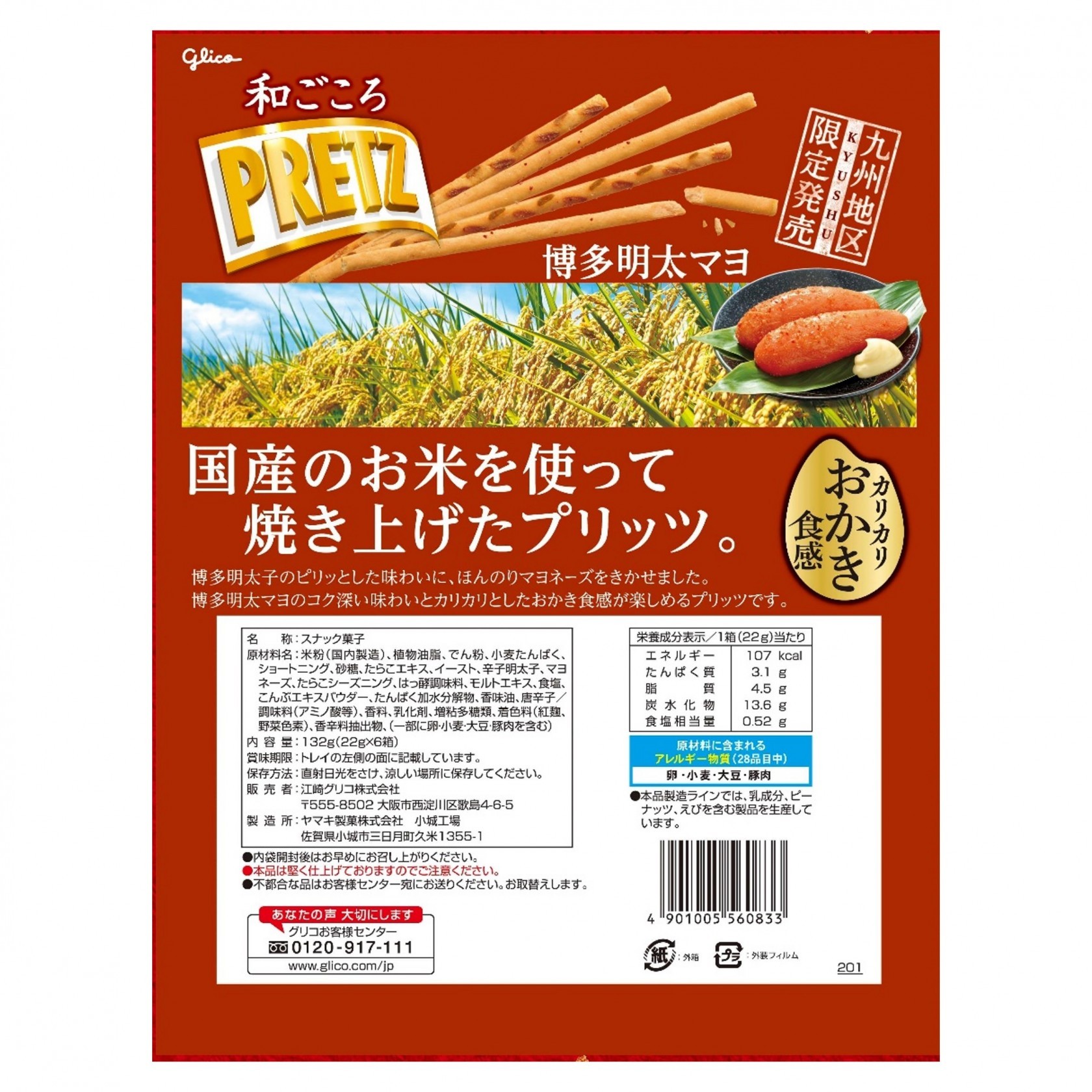 博多明太子のピリッとした味わいに、ほんのりマヨネーズをきかせた九州地区限定のお土産プリッツです。お米を使って焼き上げているので、カリカリとしたおかき食感と博多明太マヨのコク深い味わいを楽しめます。小箱が6箱入っているのでちょっとしたお土産にどうぞ!