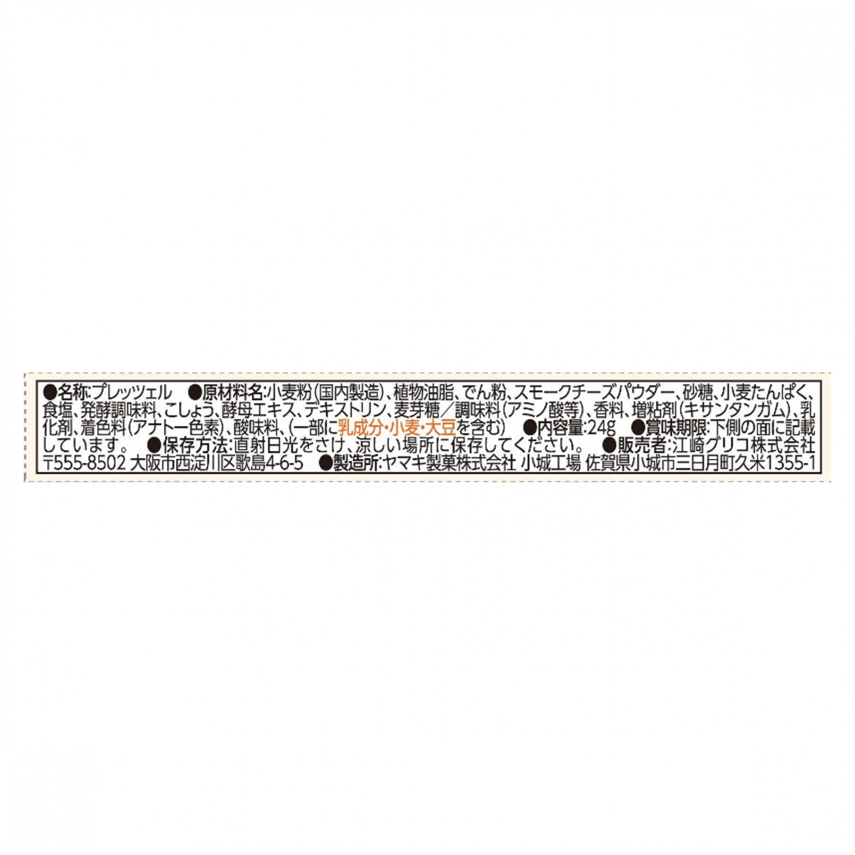 小麦粉(国内製造)、植物油脂、でん粉、スモークチーズパウダー、砂糖、小麦たんぱく、食塩、発酵調味料、こしょう、酵母エキス、デキストリン、麦芽糖/調味料(アミノ酸等)、香料、増粘剤(キサンタンガム)、乳化剤、着色料(アナトー色素)、酸味料、(一部に乳成分・小麦・大豆を含む)