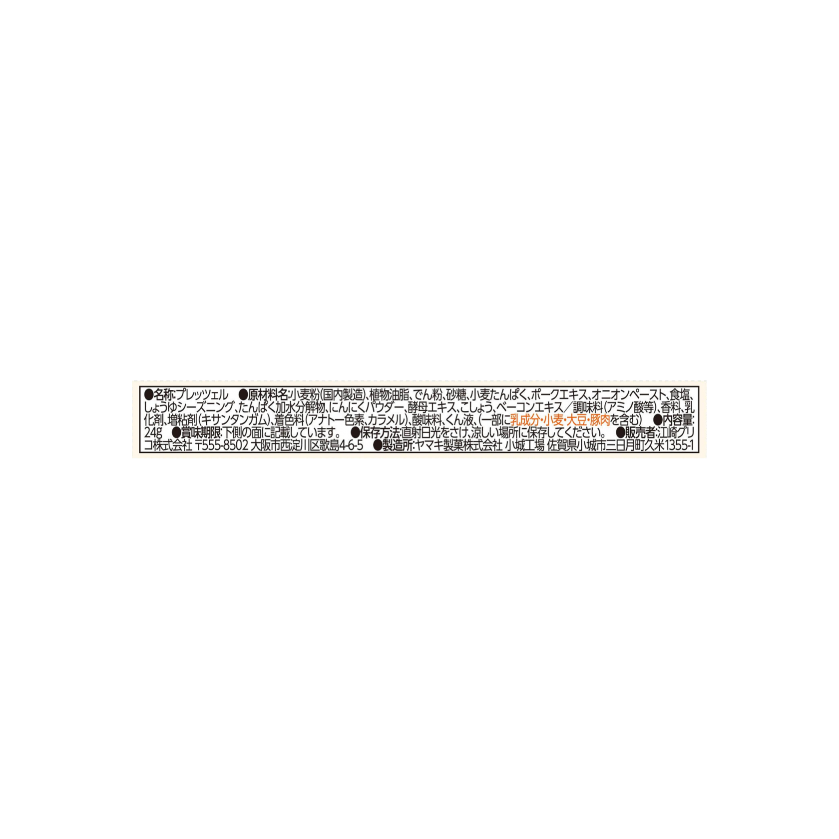 小麦粉(国内製造)、植物油脂、でん粉、砂糖、小麦たんぱく、ポークエキス、オニオンペースト、食塩、しょうゆシーズニング、たんぱく加水分解物、にんにくパウダー、酵母エキス、こしょう、ベーコンエキス/調味料(アミノ酸等)、香料、乳化剤、増粘剤(キサンタンガム)、着色料(アナトー色素、カラメル)、酸味料、くん液、(一部に乳成分・小麦・大豆・豚肉を含む)