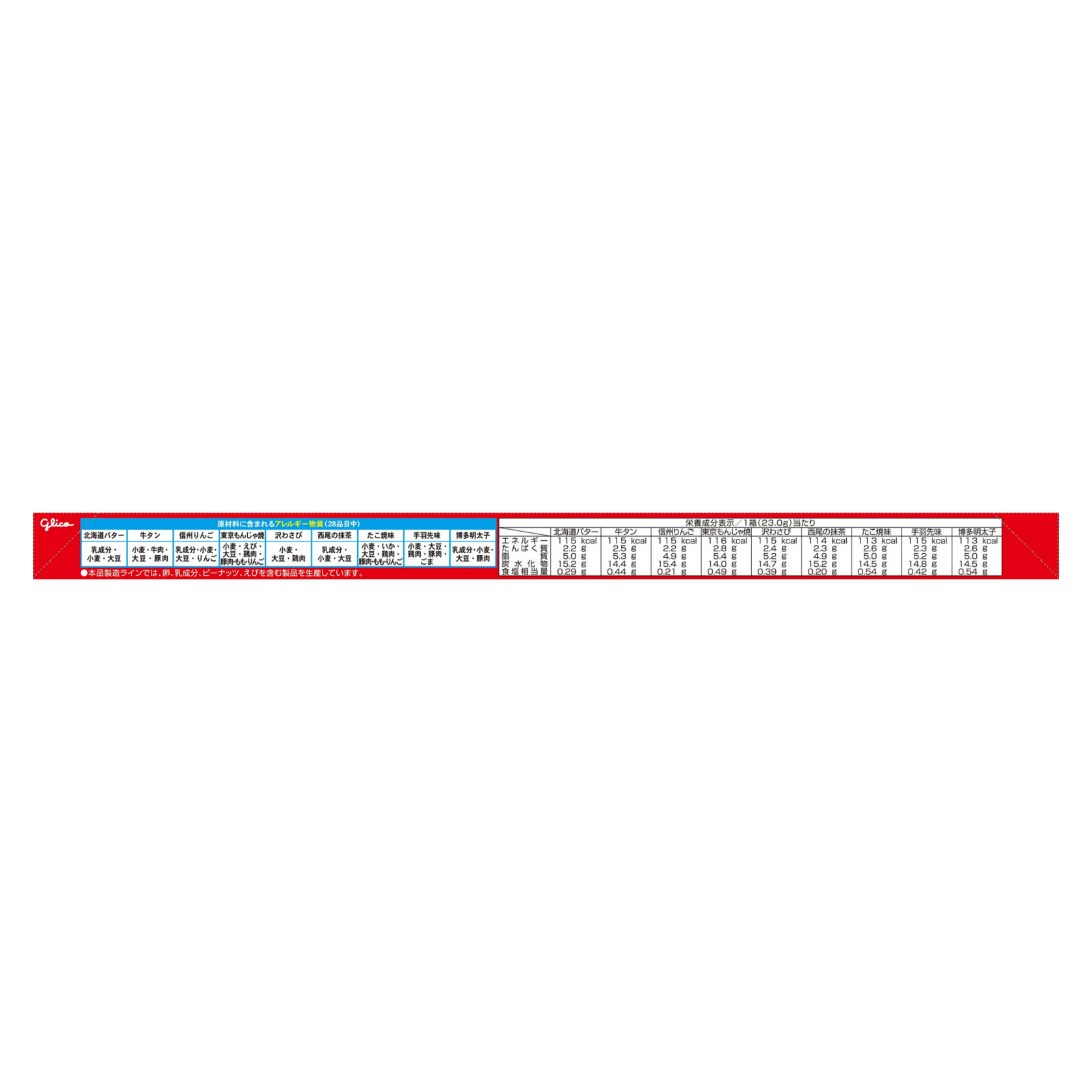 見出し(表示されません) 見出し(表示されません) 見出し(表示されません) 見出し(表示されません) 見出し(表示されません) 見出し(表示されません) 北海道バター 牛タン 信州りんご 東京もんじゃ焼 沢わさび エネルギー 115kcal 115kcal 115kcal 116kcal 115kcal たんぱく質 2.2g 2.5g 2.2g 2.8g 2.4g 脂質 5.0g 5.3g 4.9g 5.4g 5.2g 炭水化物 15.2g 14.4g 15.4g 14.0g 14.7g 食塩相当量 0.29g 0.44g 0.21g 0.49g 0.39g 見出し(表示されません) 見出し(表示されません) 見出し(表示されません) 見出し(表示されません) 見出し(表示されません) 西尾の抹茶 たこ焼味 博多明太子 手羽先味 エネルギー 114kcal 113kcal 113kcal 115kcal たんぱく質 2.3g 2.6g 2.6g 2.3g 脂質 4.9g 5.0g 5.0g 5.2g 炭水化物 15.2g 14.5g 14.5g 14.8g 食塩相当量 0.20g 0.54g 0.54g 0.42g