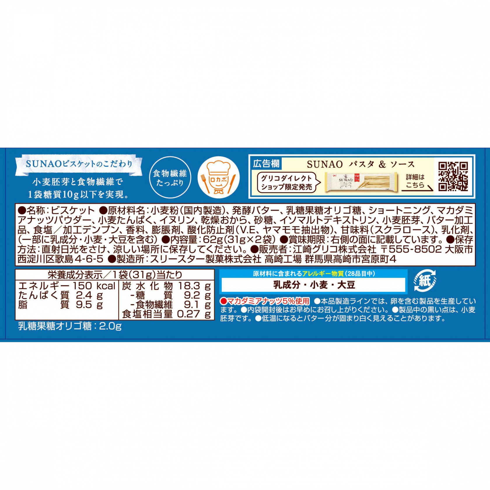 小麦粉(国内製造)、発酵バター、乳糖果糖オリゴ糖、ショートニング、マカダミアナッツパウダー、小麦たんぱく、イヌリン、乾燥おから、砂糖、イソマルトデキストリン、小麦胚芽、バター加工品、食塩/加工デンプン、香料、膨脹剤、酸化防止剤(V.E、ヤマモモ抽出物)、甘味料(スクラロース)、乳化剤、(一部に乳成分・小麦・大豆を含む)