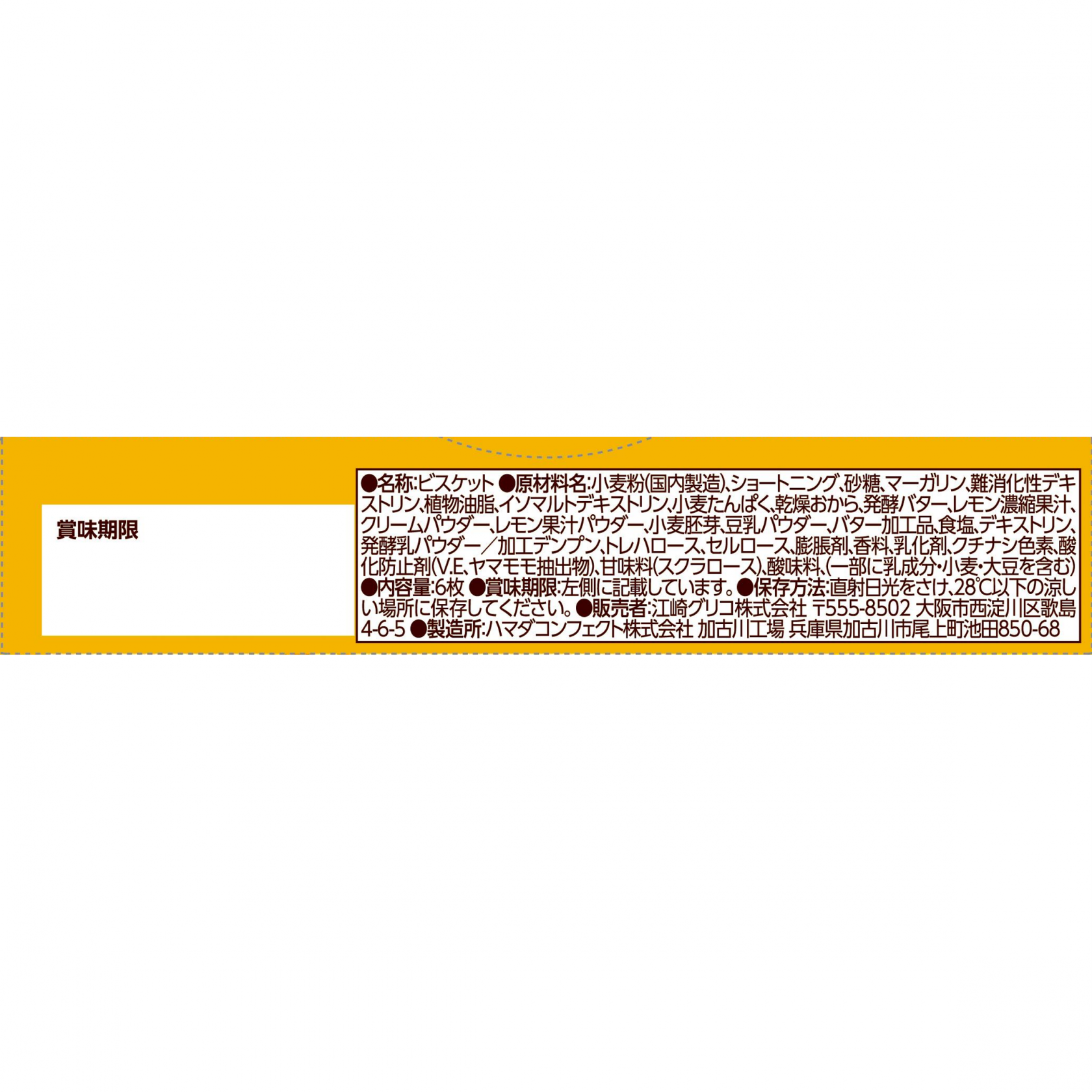 小麦粉(国内製造)、ショートニング、砂糖、マーガリン、難消化性デキストリン、植物油脂、イソマルトデキストリン、小麦たんぱく、乾燥おから、発酵バター、レモン濃縮果汁、クリームパウダー、レモン果汁パウダー、小麦胚芽、豆乳パウダー、バター加工品、食塩、デキストリン、発酵乳パウダー/加工デンプン、トレハロース、セルロース、膨脹剤、香料、乳化剤、クチナシ黄色素、酸化防止剤(V.E、ヤマモモ抽出物)、甘味料(スクラロース)、酸味料、(一部に乳成分・小麦・大豆を含む)