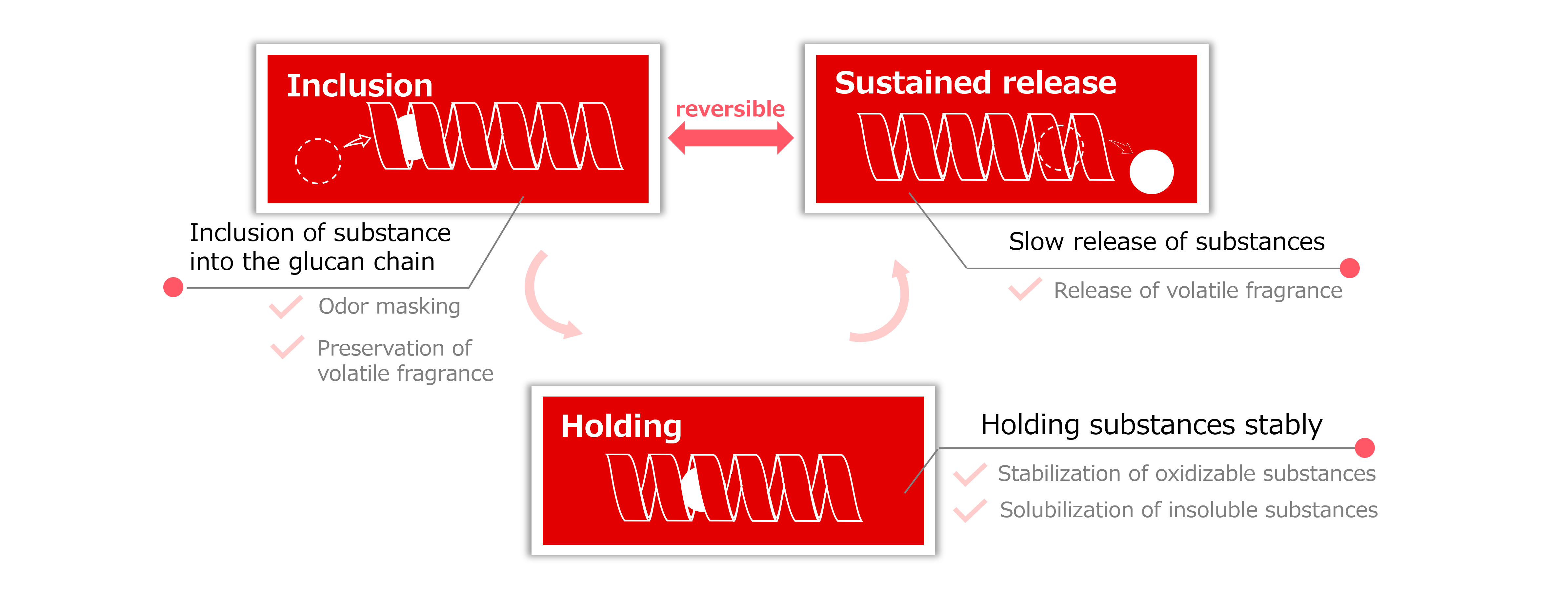 The interior of helical structures are hydrophobic and can form inclusion complexes with guest molecules. Therefore, Cluster Dextrin can hold and release guest materials depending on the environment. Some of the effects that can be expected are stable retention of fragrance, reduction of unpleasant odor or irritancy, and stabilization of unstable materials.