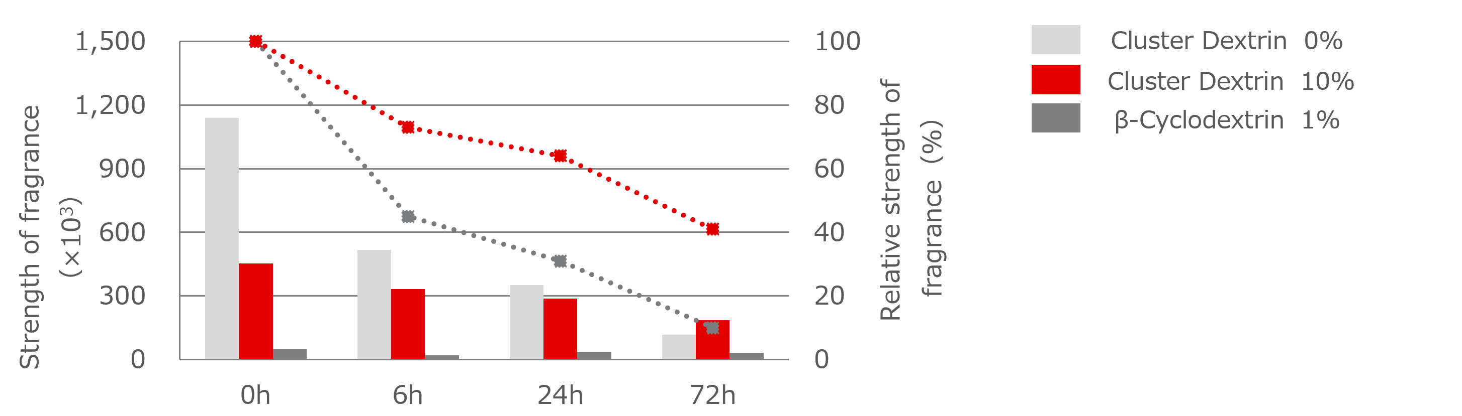 This results suggest that in liquid applications, the sustained release function of Cluster Dextrins can be expected to maintain fragrance.