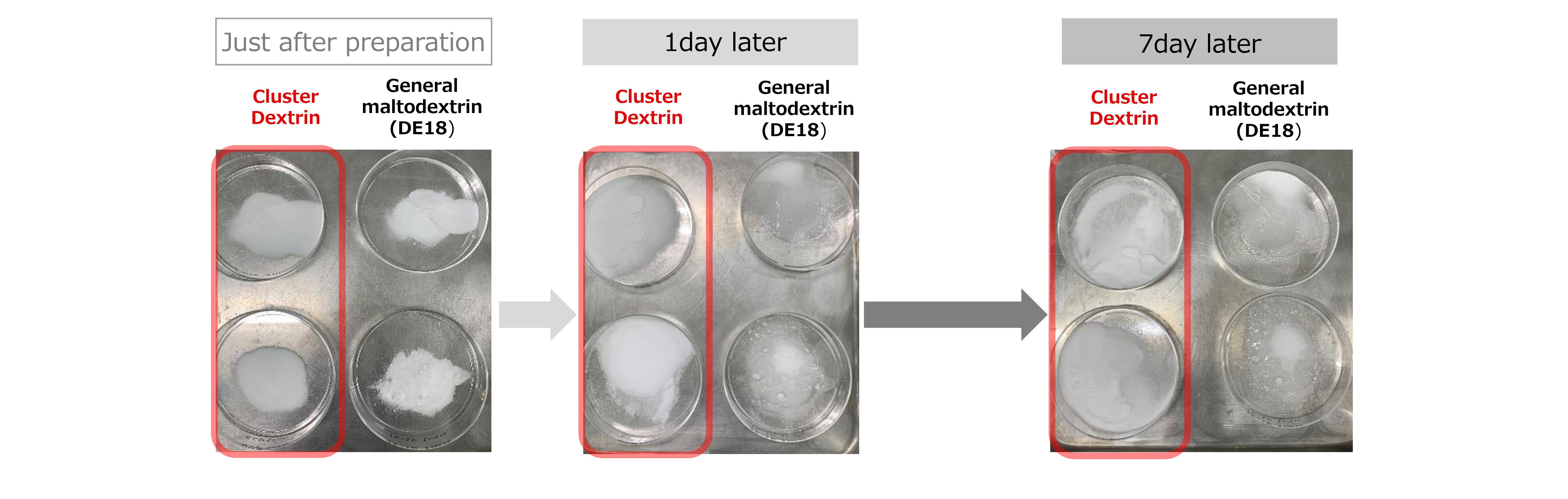As a result, it was confirmed that the powdered flavoring agent with Cluster Dextrin maintained its fluid state compared to general maltodextrin.
