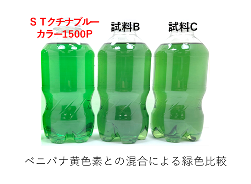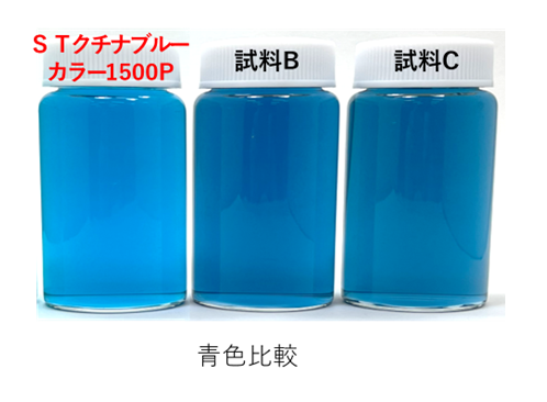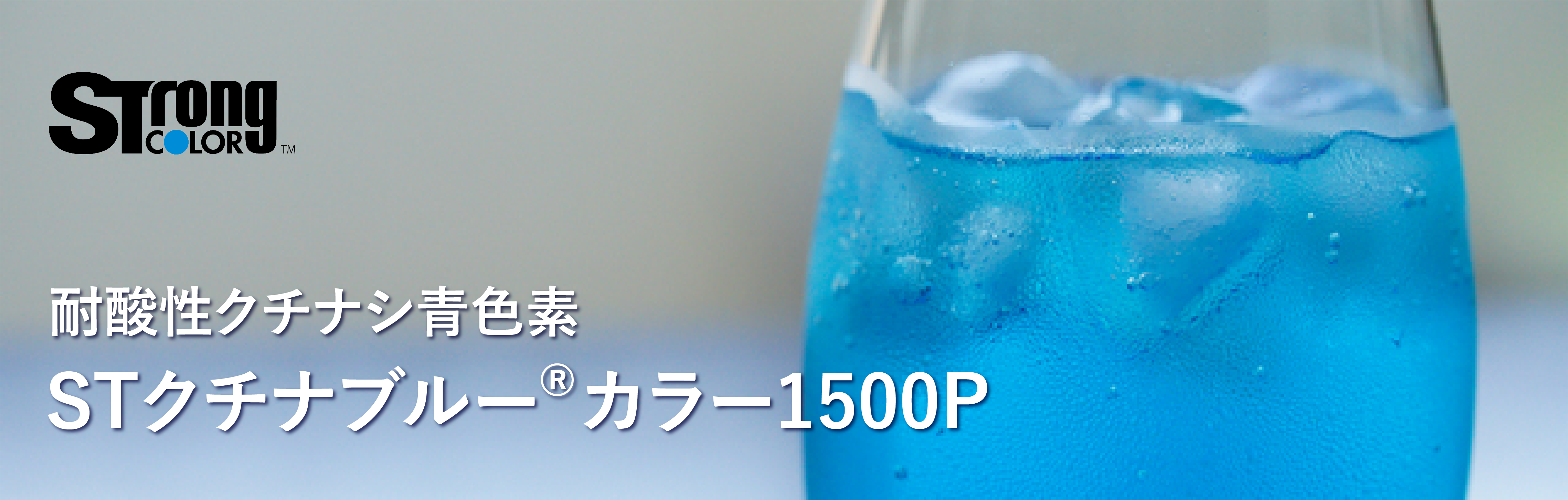 そこで当社は、独自の特許技術(特許第7323322号)により、酸性条件下の加熱後でも鮮明な青色を維持できる新しいクチナシ青色素「STクチナブルーカラー1500P」を開発しました。