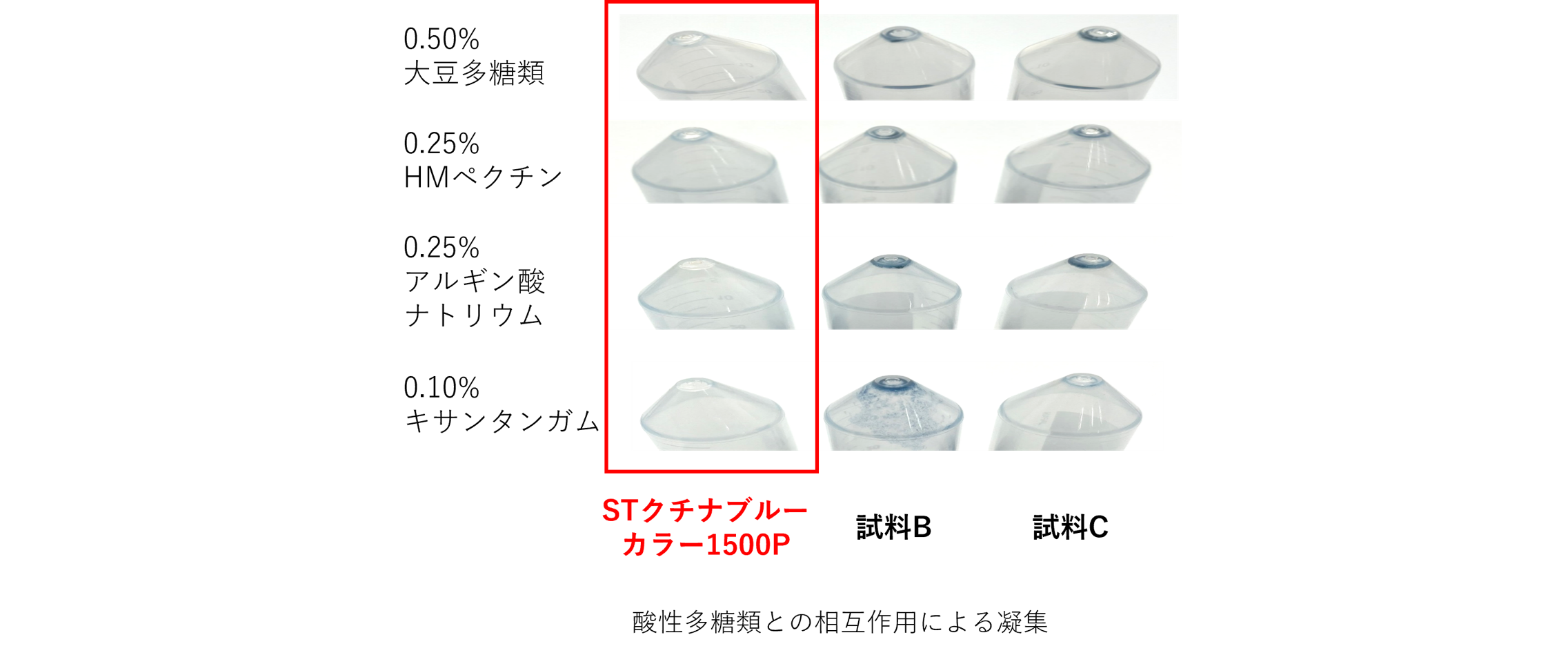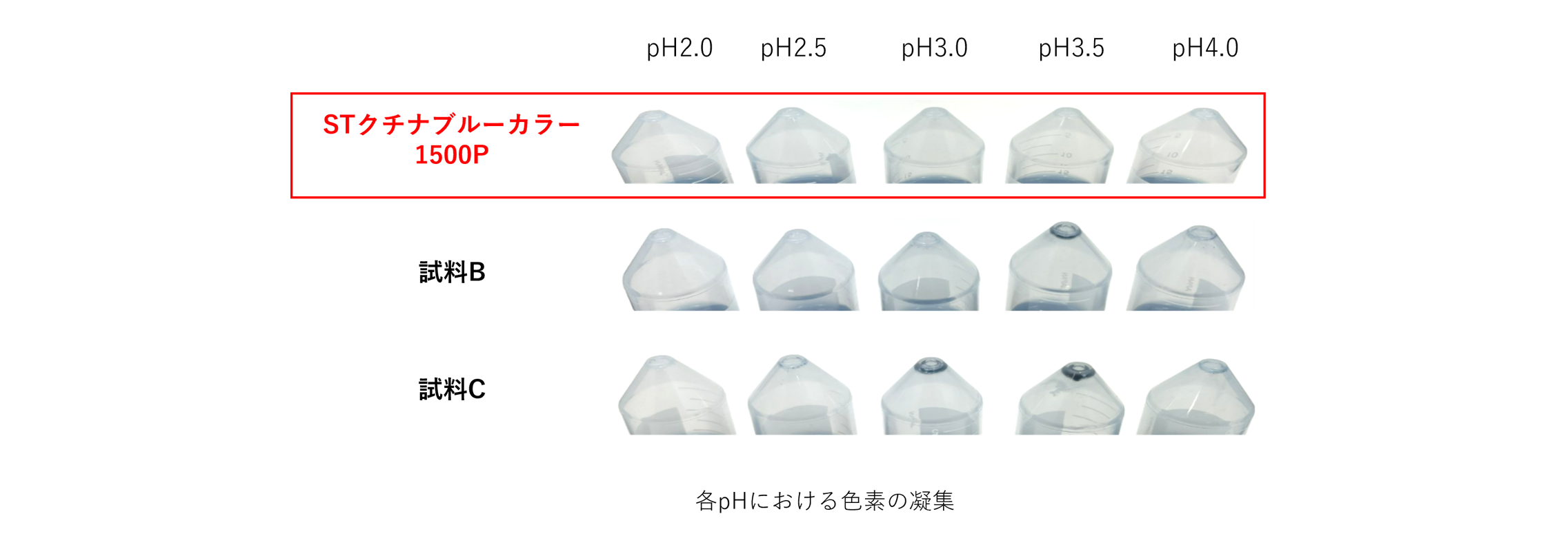 従来型の耐酸性クチナシ青色素と比較して酸性条件下で凝集が見られません。