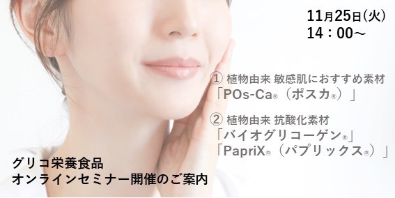 【オンラインセミナー】11月開催 化粧品素材セミナー ~植物由来の敏感肌におすすめ素材「POs-Ca(ポスカ)」 植物由来抗酸化素材「バイオグリコーゲン」「PapriX(パプリックス)」~のご案内