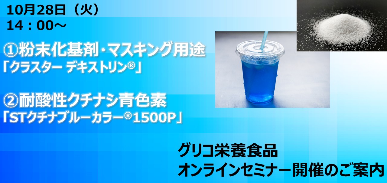 ①粉末化基剤・マスキング用途『クラスター デキストリン』 ②耐酸性クチナシ青色素『STクチナブルーカラー1500P』